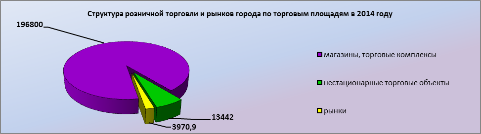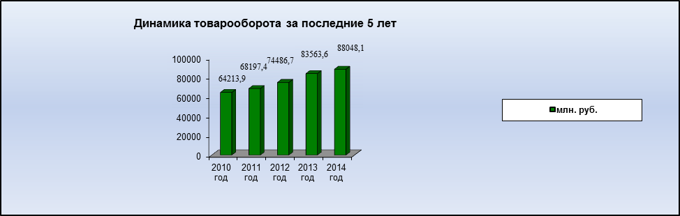 Оборот розничной торговли увеличился на 1,2% к уровню 2013 года в сопоставимых ценах и составил более 88 млрд. рублей или 329,5 тыс. рублей на душу населения. Торговая площадь за год увеличилась на 2 тыс. кв.м, обеспеченность торговыми площадями составила 736 кв.м на 1 тыс. жителей или 109,4% к нормативу (673 кв.м на 1 тыс. жителей).