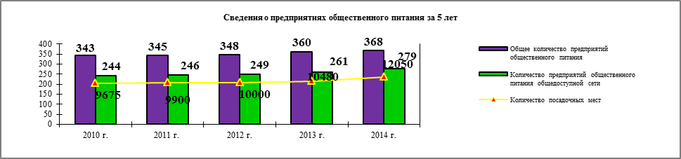 Общее количество предприятий общественного питания по состоянию на 01.01.2015 достигло 368 единиц более чем на 24,4 тысяч посадочных мест.