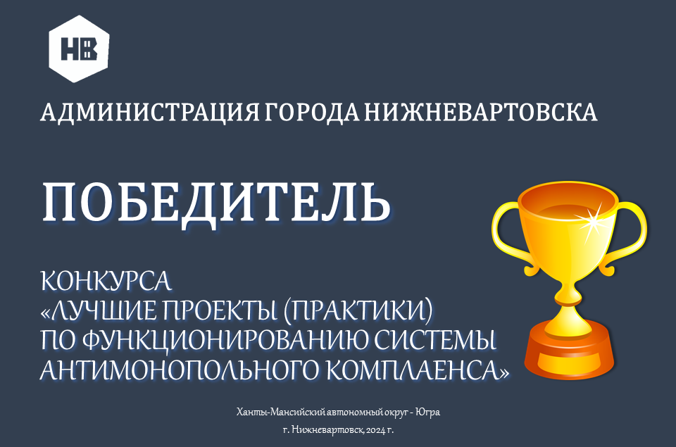 Администрация города Нижневартовска заняла I место в окружном конкурсе "Лучшие проекты (практики) по функционированию системы антимонопольного комплаенса" среди семи муниципальных образований, принявших участие в конкурсе.