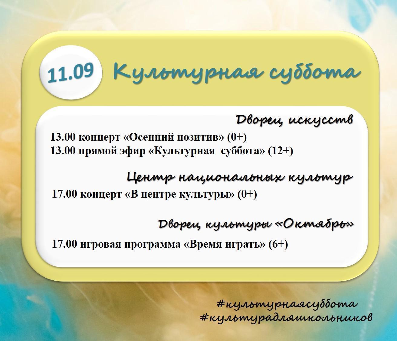 Приглашаем всех желающих принять участие в бесплатных выставках, экскурсиях, концертах, развлекательных программах. Прямые эфиры с чтением стихотворений на языках народов Российской Федерации можно посмотреть в социальных сетях с хэштегами #культурнаясуббота и #культурадляшкольников в 13.00 час.