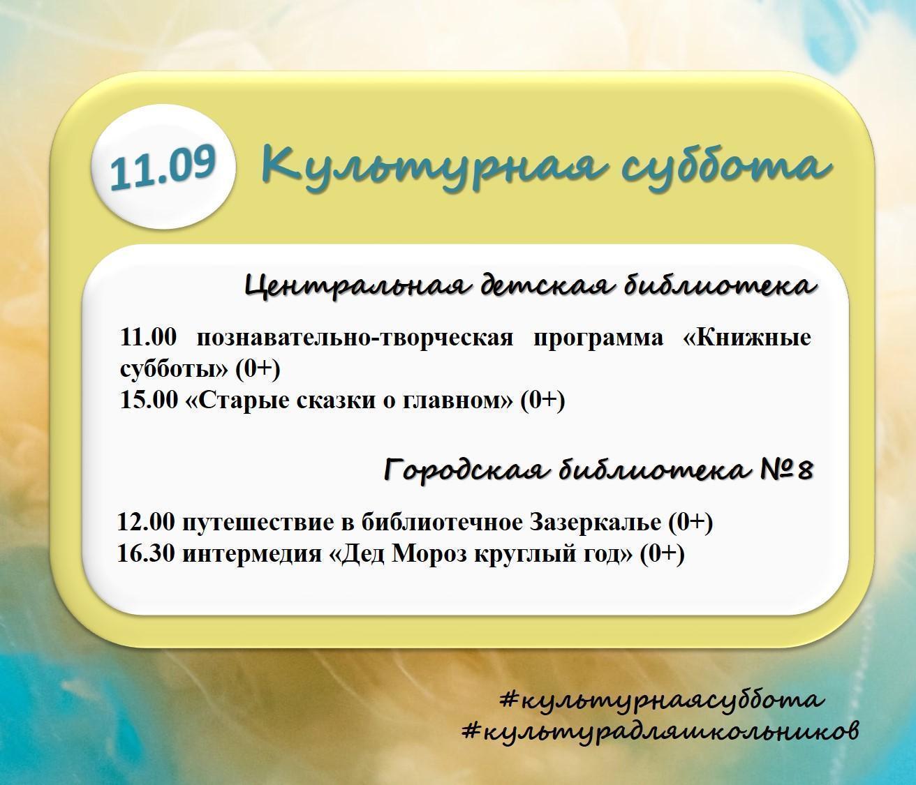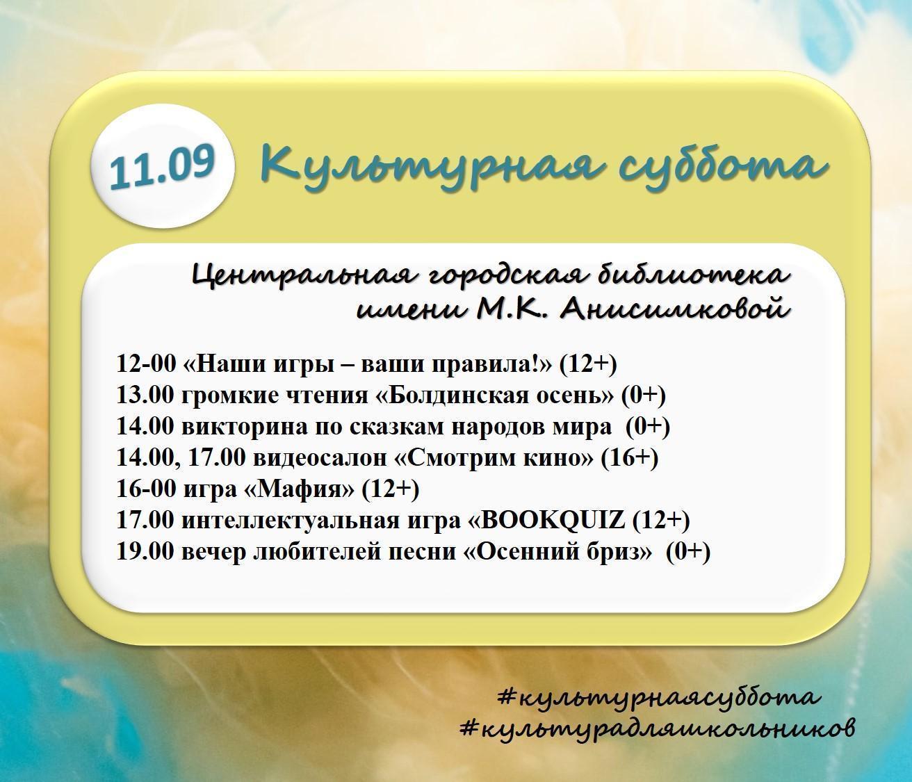 11 сентября 2021 года в учреждениях культуры пройдут мероприятия в рамках Всероссийской акции "Культурная суббота".