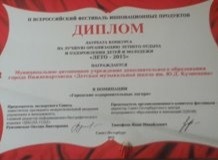 Муниципальное автономное учреждение дополнительного образования города Нижневартовска "Детская музыкальная школа им. Ю.Д. Кузнецова" стала лауреатом Всероссийского конкурса на лучшую организацию летнего отдыха и молодежи "ЛЕТО - 2015", проводимого в рамках II Всероссийского Фестиваля инновационных продуктов в городе Санкт-Петербурге.