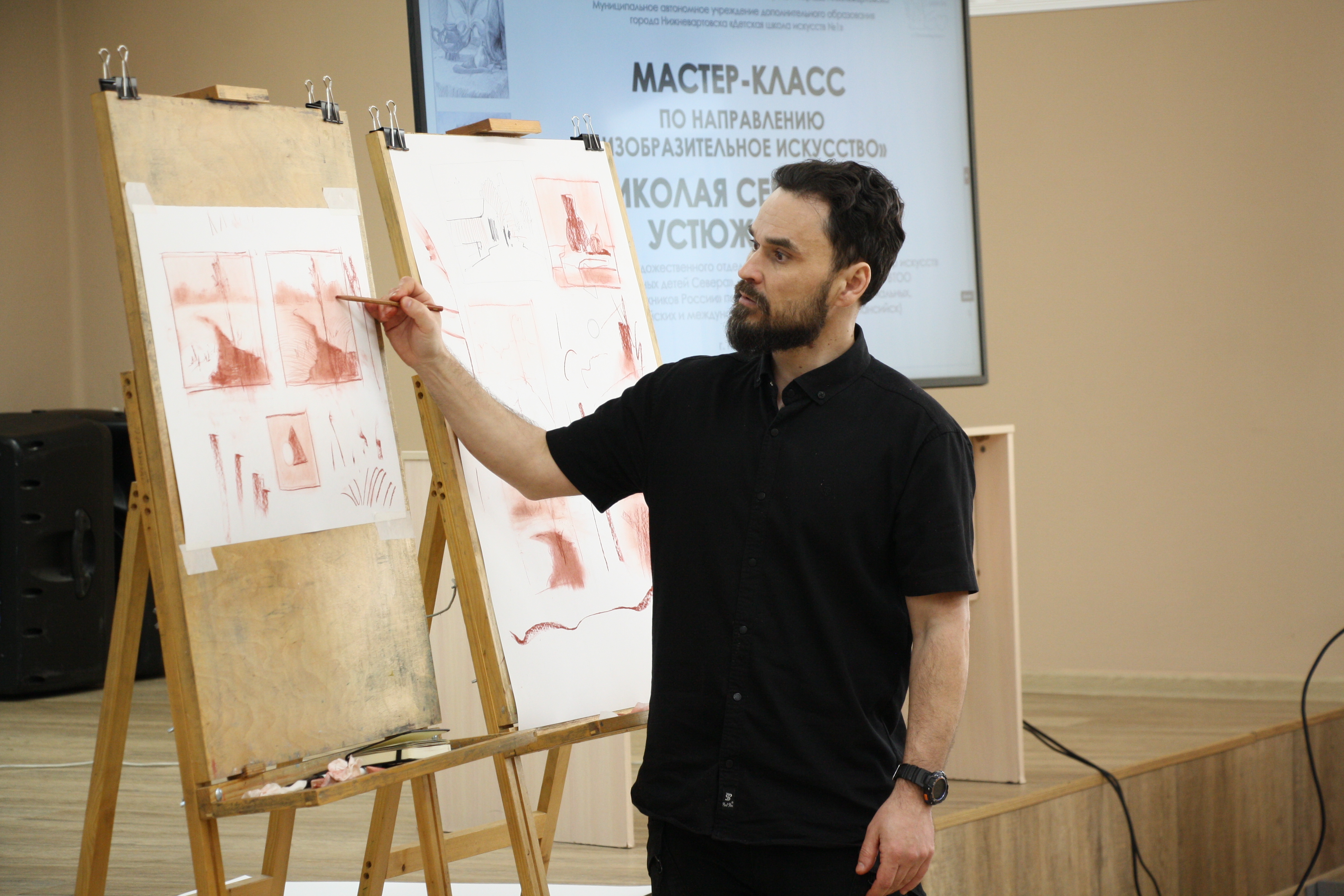 23 марта 2026 года с целью выявления и поддержки молодых дарований в области изобразительного искусства для обучающихся художественных отделений детских школ искусств Нижневартовска состоялся мастер-класс по теме "Работа с мягким материалом" преподавателя художественного отделения Колледжа-интерната "Центр искусств для одаренных детей Севера" , члена регионального отделения ВТОО "Союз Художников России" по ХМАО-Югре Устюжанина Николая Сергеевича (г. Ханты-Мансийск).