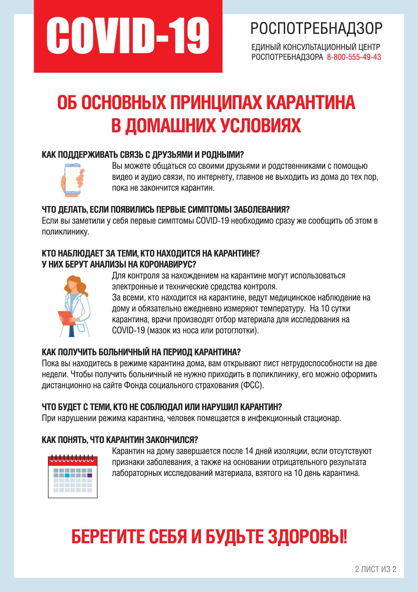 Карантин на дому завершается после 14 дней изоляции, если отсутствуют признаки заболевания, а также на основании отрицательного результата лабораторных исследований материала, взятого на 10 день карантина.