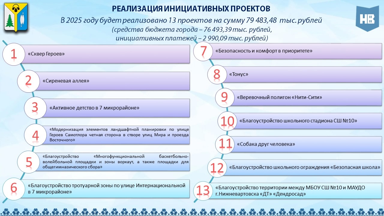 В 2025 году на территории города Нижневартовска планируется реализовать 13 инициативных проектов, которые представлены в инфографике