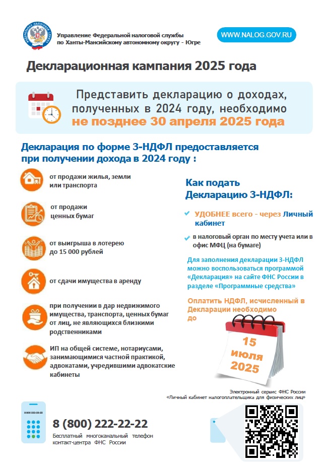 На сайте ФНС России www.nalog.gov.ru размещена промостраница "Декларационная кампания 2025" (www.nalog.gov.ru/rn77/taxat...) с подробной информацией о том, когда возникает обязанность отчитаться о полученных в 2024 году доходах и когда такая обязанность отсутствует; с примерами заполнения деклараций по форме 3-НДФЛ и способах представления декларации в налоговый орган.