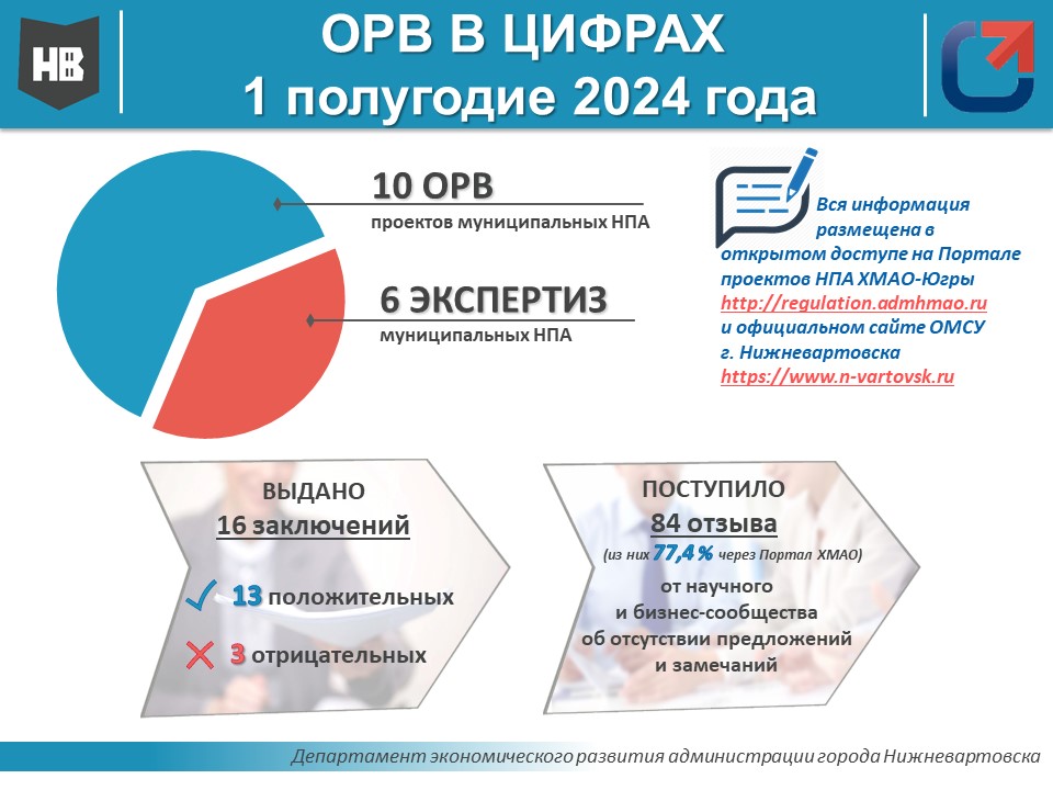 Департаментом экономического развития администрации города Нижневартовска подведены итоги проведения оценки регулирующего воздействия (ОРВ) проектов муниципальных нормативных правовых актов, экспертизы муниципальных нормативных правовых актов (МНПА), затрагивающих вопросы осуществления предпринимательской и иной экономической деятельности, инвестиционной деятельности, за 1 полугодие 2024 года.