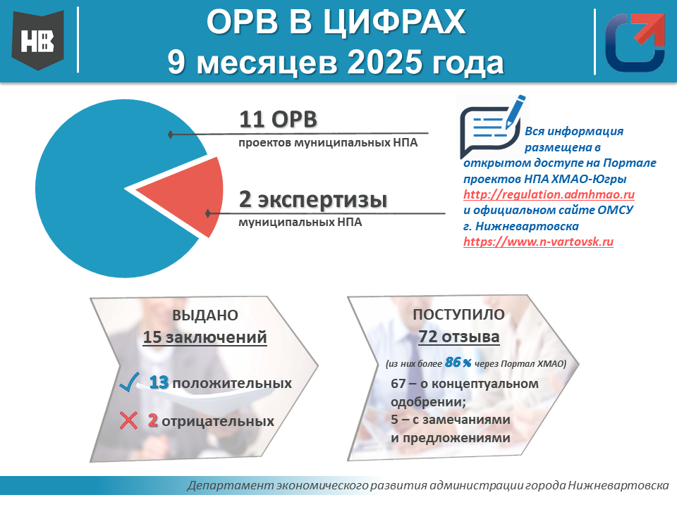 Департаментом экономического развития администрации города Нижневартовска подведены итоги проведения оценки регулирующего воздействия (ОРВ) проектов муниципальных нормативных правовых актов, экспертизы муниципальных нормативных правовых актов (МНПА), затрагивающих вопросы осуществления предпринимательской и иной экономической деятельности, инвестиционной деятельности, за 9 месяцев 2025 года.