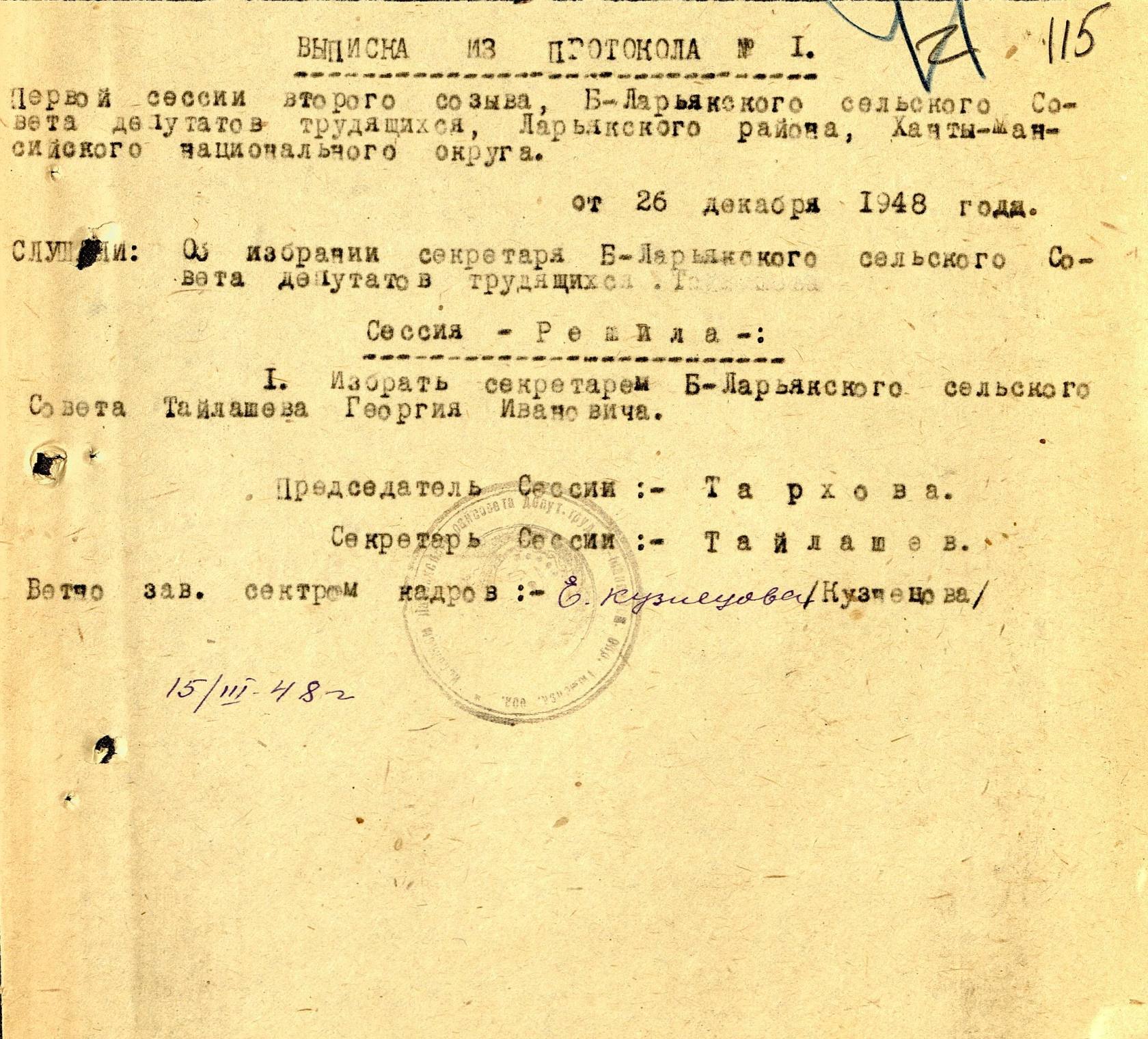 В 1946 году Тайлашев Г.И. за образцовую работу награжден значком «Отличник соцсоревнования». В декабре 1948 г. избран секретарем Больше-Ларьякского сельского Совета. Сведения позднее 1948 года не выявлены.