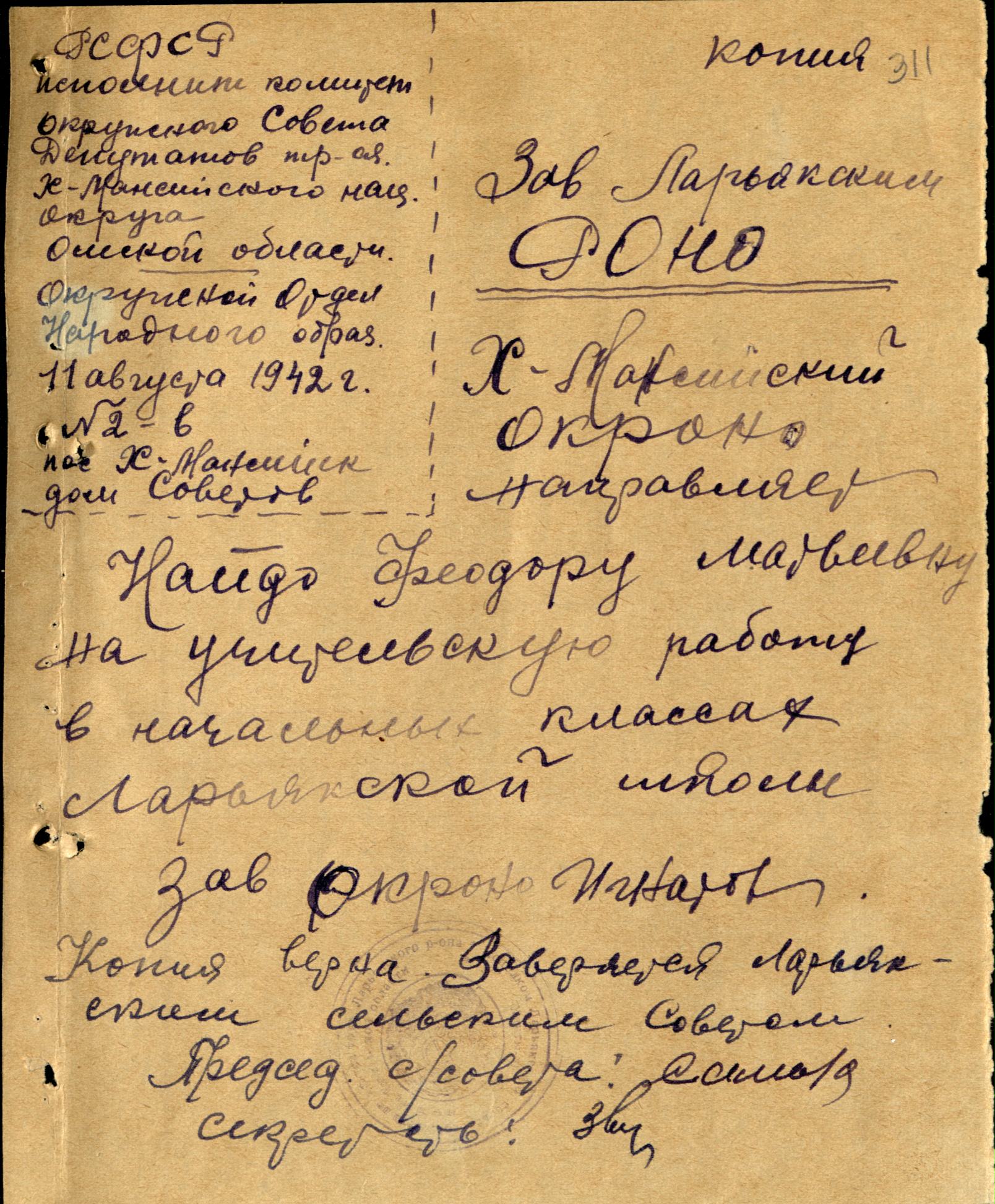 Решением бюро Ларьякского РК КПСС от 27 января 1958 года вновь командирована в распоряжение РОНО для работы в качестве учителя Ларьякской школы.
