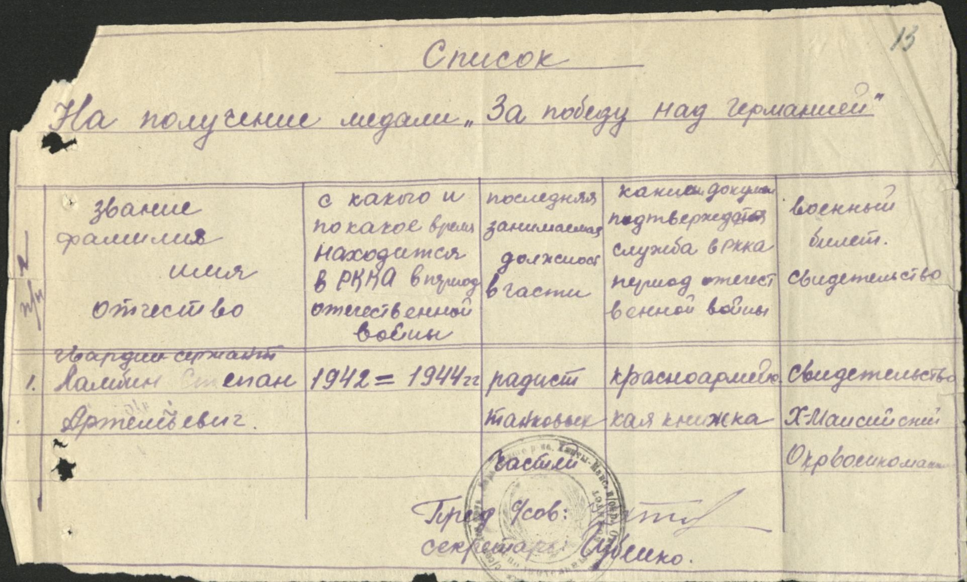 Ламбин Степан Артемьевич, ветеран Великой Отечественной войны 1941-1945 гг., участник одного из крупнейших танковых сражений под Прохоровкой в ходе Курской оборонительной операции. Ламбин Степан Артемьевич, родился 2 ноября 1924 года в селе Нижневартовск, образование - 7 классов, член ВЛКСМ. До войны работал в колхозе «Красное знамя». Призван Ларьякским РВК 26 августа 1942 года. Во время войны служил в танковых войсках в звании гвардии сержанта. Участвовал в одном из крупнейших сражений - в танковом бою под Прохоровкой, был ранен. Демобилизован в 1944 году.