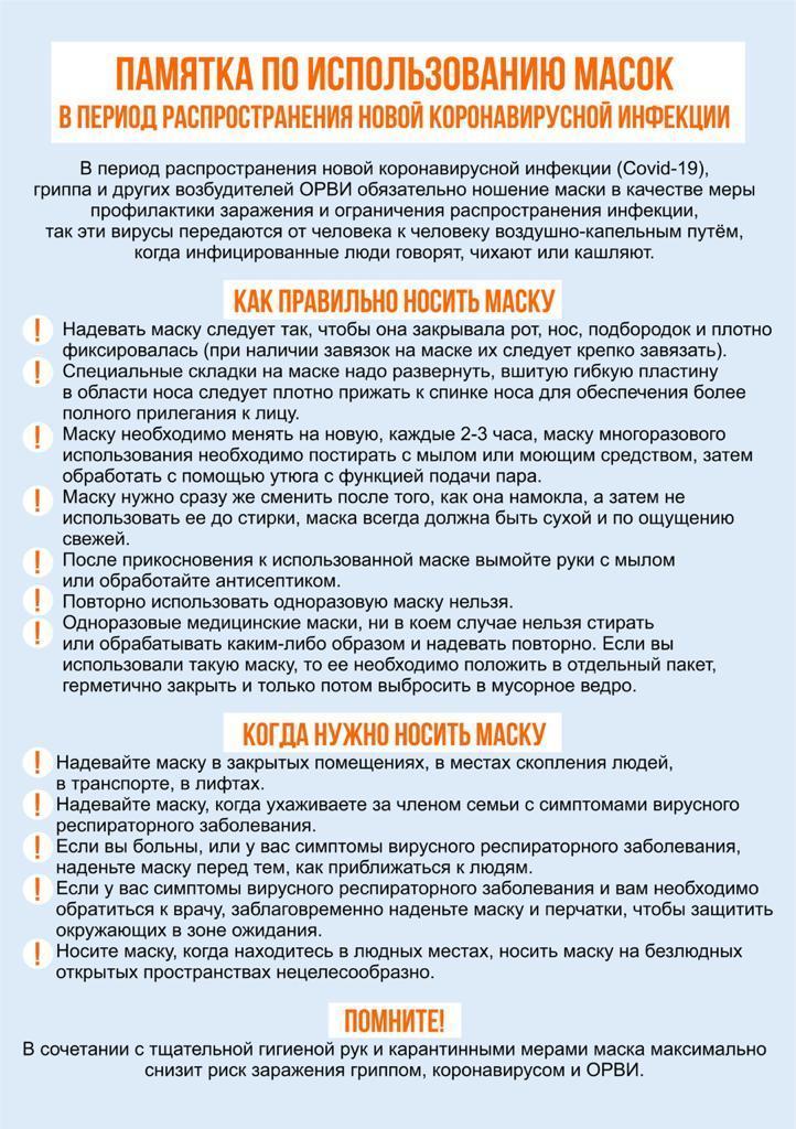 В связи со сложившейся неблагополучной эпидемиологической ситуацией предлагаем Вам ознакомиться с Памяткой по использованию масок в период распространения новой коронавирусной инфекции.