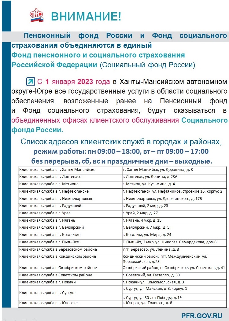 Пенсионный Фонд РФ и Фонд социального страхования с 1 января 2023 года объединяются в единый Фонд пенсионного и социального страхования Российской Федерации (Социальный фонд России). Начиная со следующего года в Югре все государственные услуги в области социального обеспечения, возложенные ранее на Пенсионный фонд и Фонд социального страхования, будут оказываться в объединённых офисах клиентского обслуживания Социального фонда России.