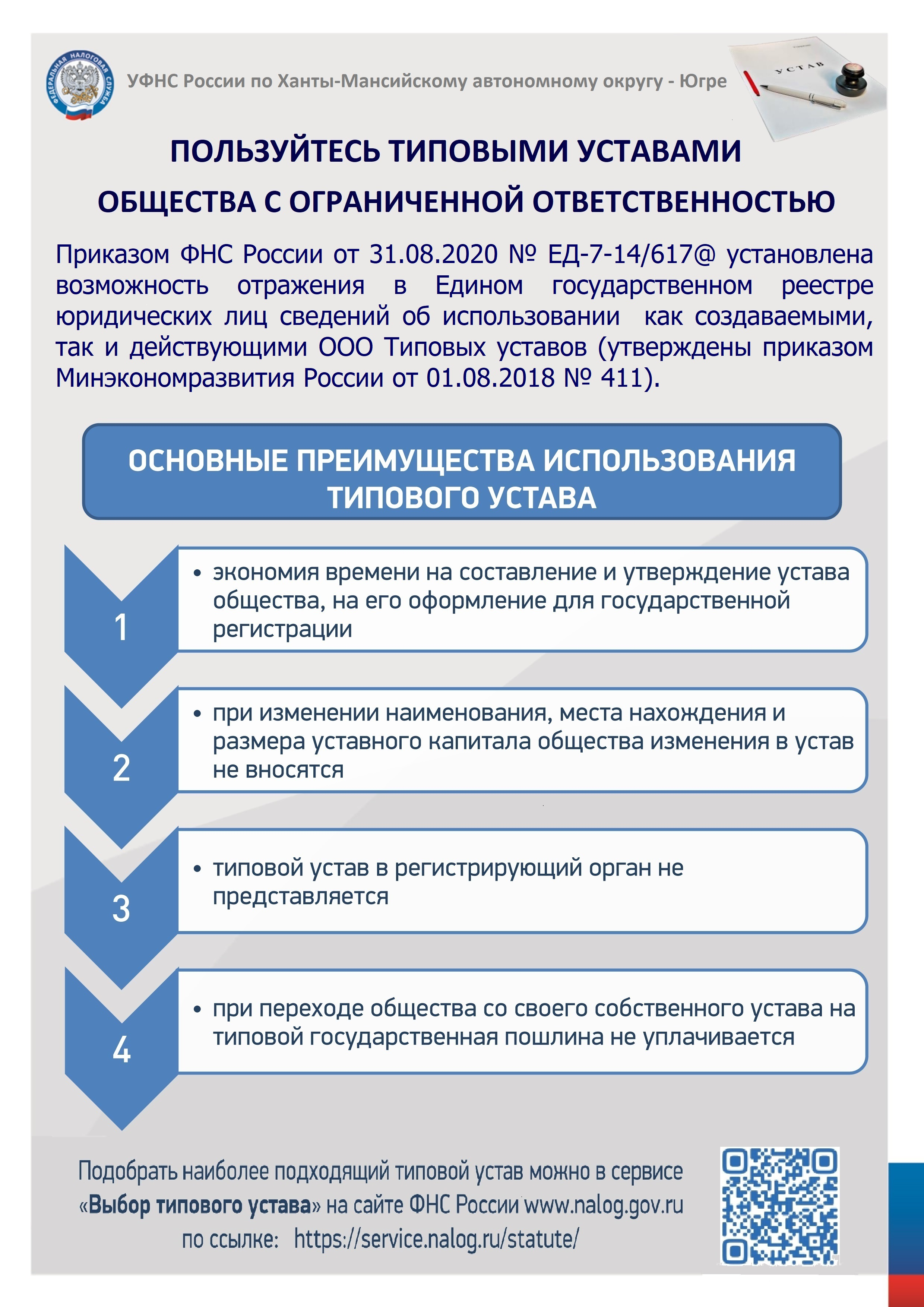 С целью повышения качества услуг по государственной регистрации юридических лиц, предлагаем Вам ознакомиться с преимуществами использования типовых уставов, а именно: