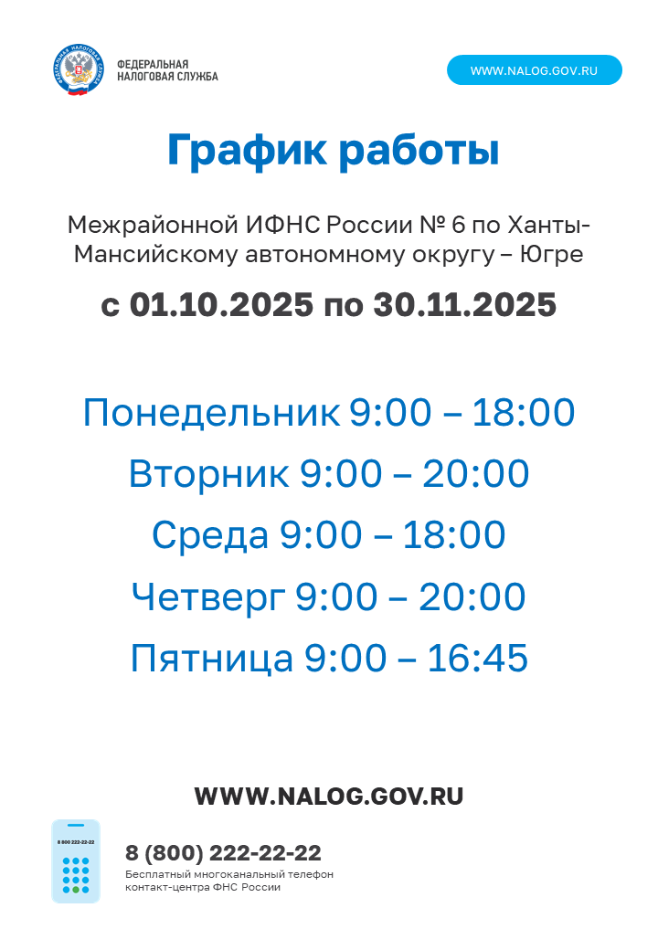 Сообщаем об изменении режима работы операционного зала Межрайонной ИФНС России №6 по Ханты-Мансийскому автономному округу - Югре в период проведения информационной кампании по уплате имущественных налогов с 1 октября 2025 года по 30 ноября 2025 года: