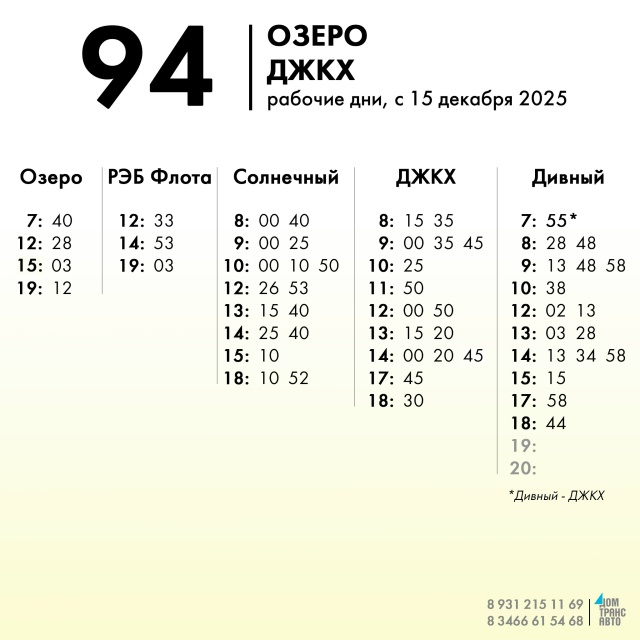 Расписание движения муниципальных автобусов в зимний период 2025 / 2026 (с 01.10.2025-30.04.2026)