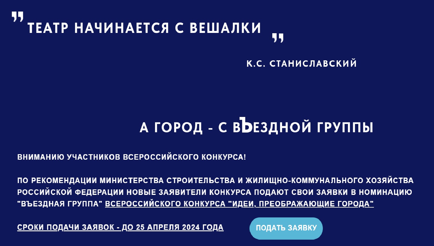 По рекомендации Министерства строительства и жилищно-коммунального хозяйства Российской Федерации новые заявители конкурса «Моя въездная группа» могут подать заявку в срок до 24 апреля 2024 года в номинацию «Въездная группа» Всероссийского конкурса «Идеи, преображающие города»