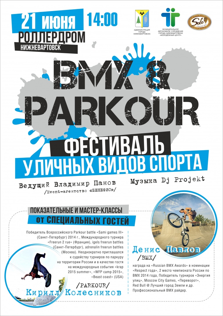 На мероприятие приглашены победитель чемпионата России по ВМХ в номинации «Парк» Денис Павлов (г.Москва) и победитель Всероссийского Parkour battle «Sami games III», Международного турнира «Freerun 2 rue» во Франции Кирилл Колесников (г.Санкт-Петербург), которые проведут показательные выступления и мастер-классы для молодежи Нижневартовска. Ведущий программы Владимир Панов (event-агентство» БЕНЕФИС»).