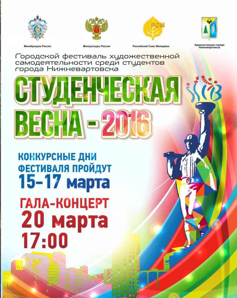 С 15 по 20 марта 2016 года в городе Нижневартовске пройдет городской фестиваль художественной самодеятельности среди студентов профессиональных образовательных организаций и образовательных организаций высшего образования «Студенческая весна-2016».