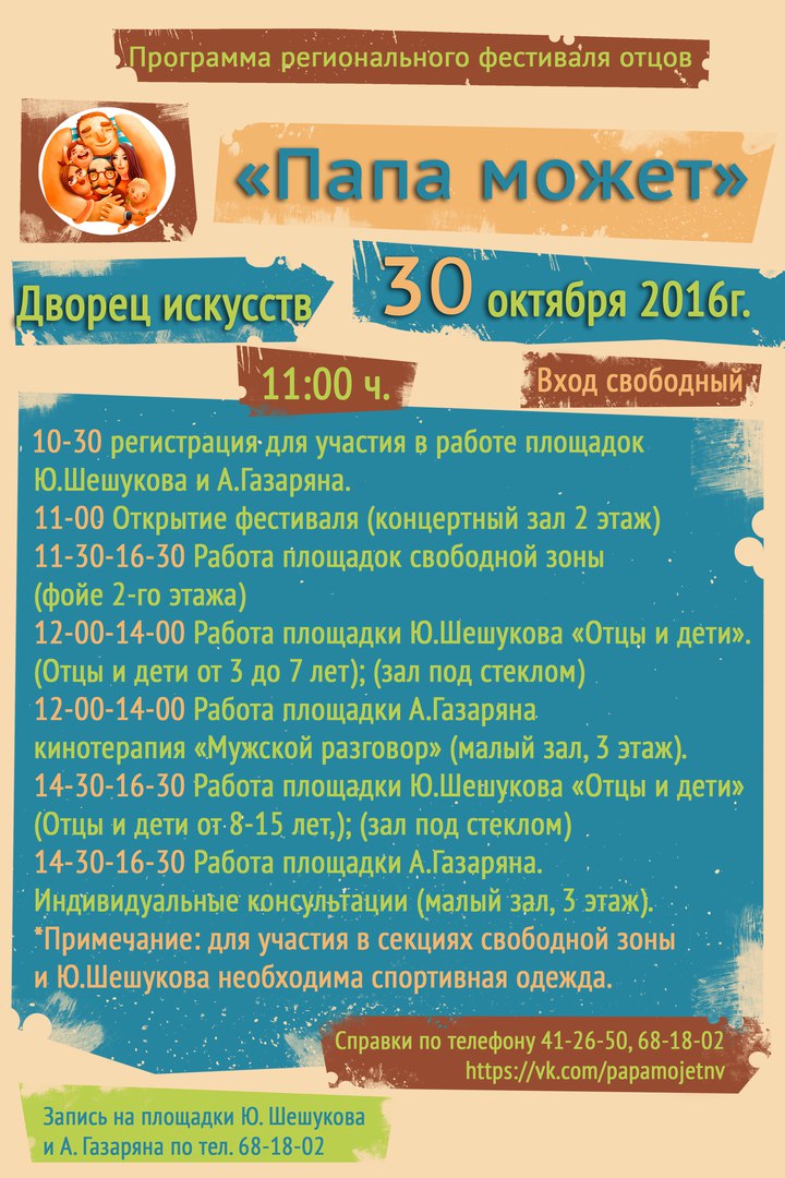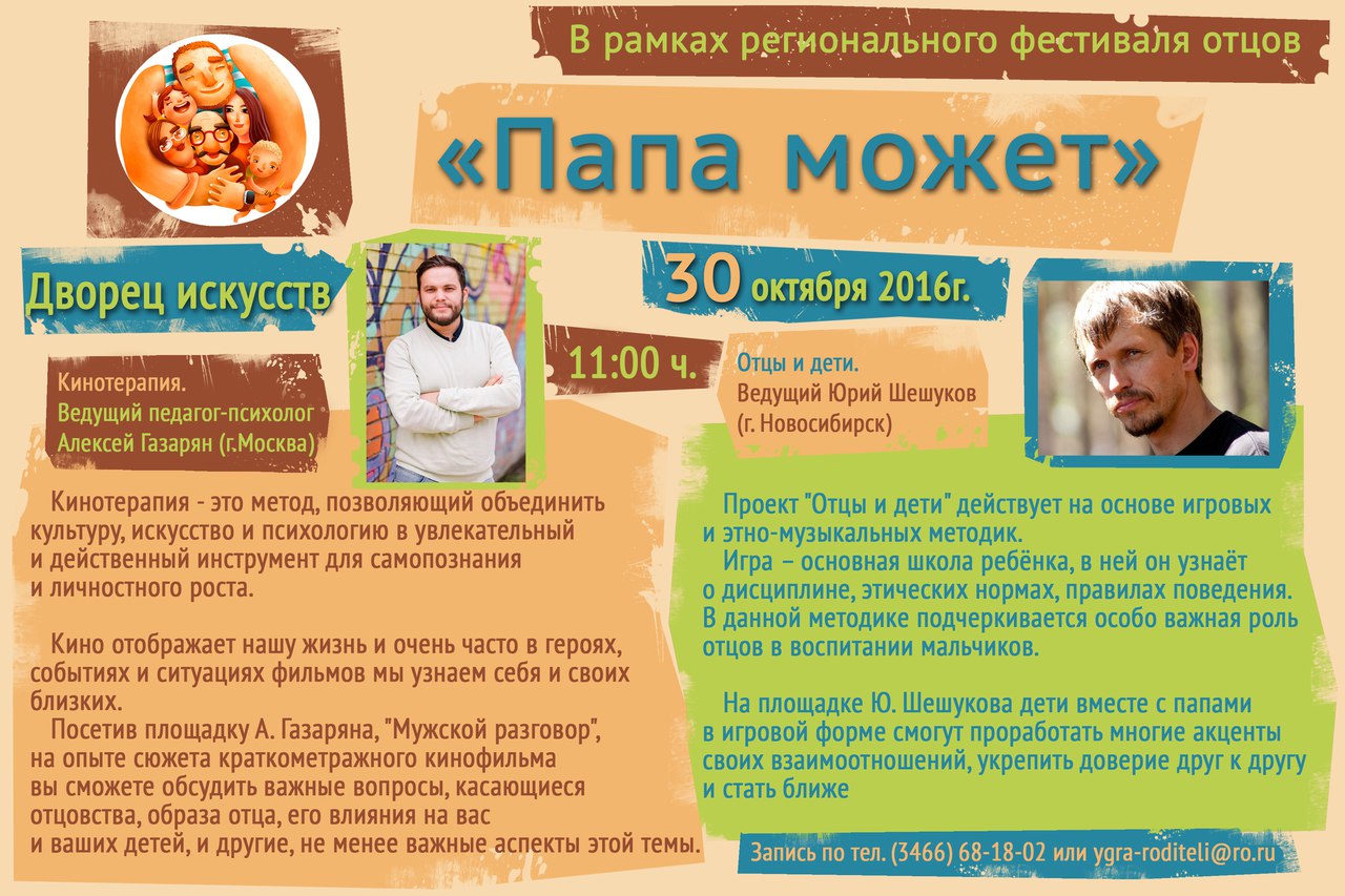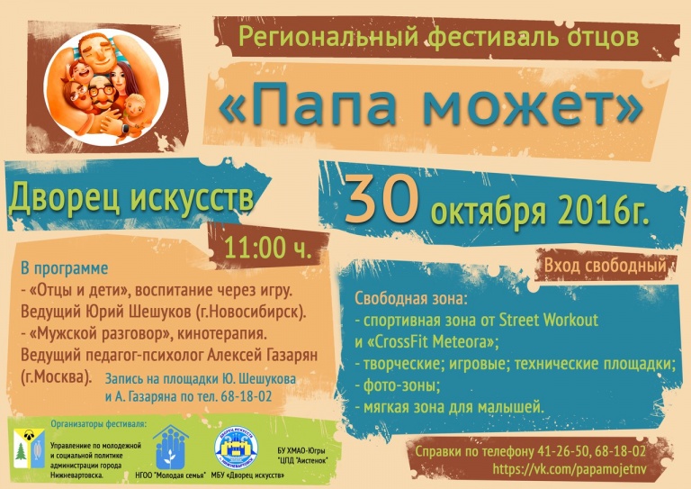 Приглашаем семьи города для участия в Региональном фестивале отцов «Папа может», который состоится 30 октября 2016 года в 11.00 часов в МБУ "Дворец искусств". Организаторами проекта являются: управление по социальной и молодежной политике администрации города, муниципальное бюджетное учреждение «Дворец искусств», Нижневартовская городская общественная организация «Молодая семья» при поддержке Центра детского и юношеского технического творчества «Патриот», Центра технических и прикладных видов спорта «Юность Самотлора», 5 отряда Федеральной противопожарной службы по ХМАО - Югре, Нижневартовского медицинского колледжа, Нижневартовского строительного колледжа, Нижневартовского политехнического колледжа, Центра детского творчества, Нижневартовского государственного университета, компании по проведению детских праздников «Сумасшедшая наука», клуба-магазина настольных игр «Игровая», сети магазинов «Бегемотик», спортивного клуба «CrossFit Meteora», спортивного движения «Workout» («Простые парни»), компании «Данцер».