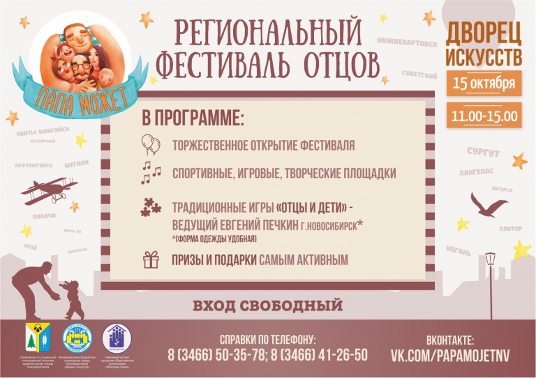 Приглашаем Югорские семьи принять участие в Региональном фестивале отцов «Папа может», который состоится 15 октября 2017 года в 11:00 часов в муниципальном бюджетном учреждении "Дворце искусств" города Нижневартовска.