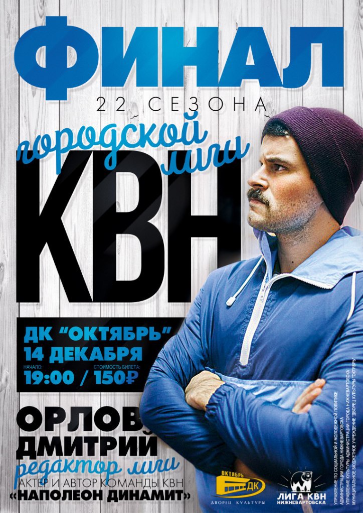 14 декабря 2017 года в 19:00 состоится финал 22 сезона городской лиги КВН города Нижневартовска. Самые опытные команды и победители фестивалей КВН 2017 года представят на суд зрителей и жюри лучшие номера и миниатюры. Редактором игры станет Дмитрий Орлов актер и автор команды КВН «Наполеон динамит», полуфиналист Премьер лиги в 2016 году и участник Высшей лиги в 2017 году.