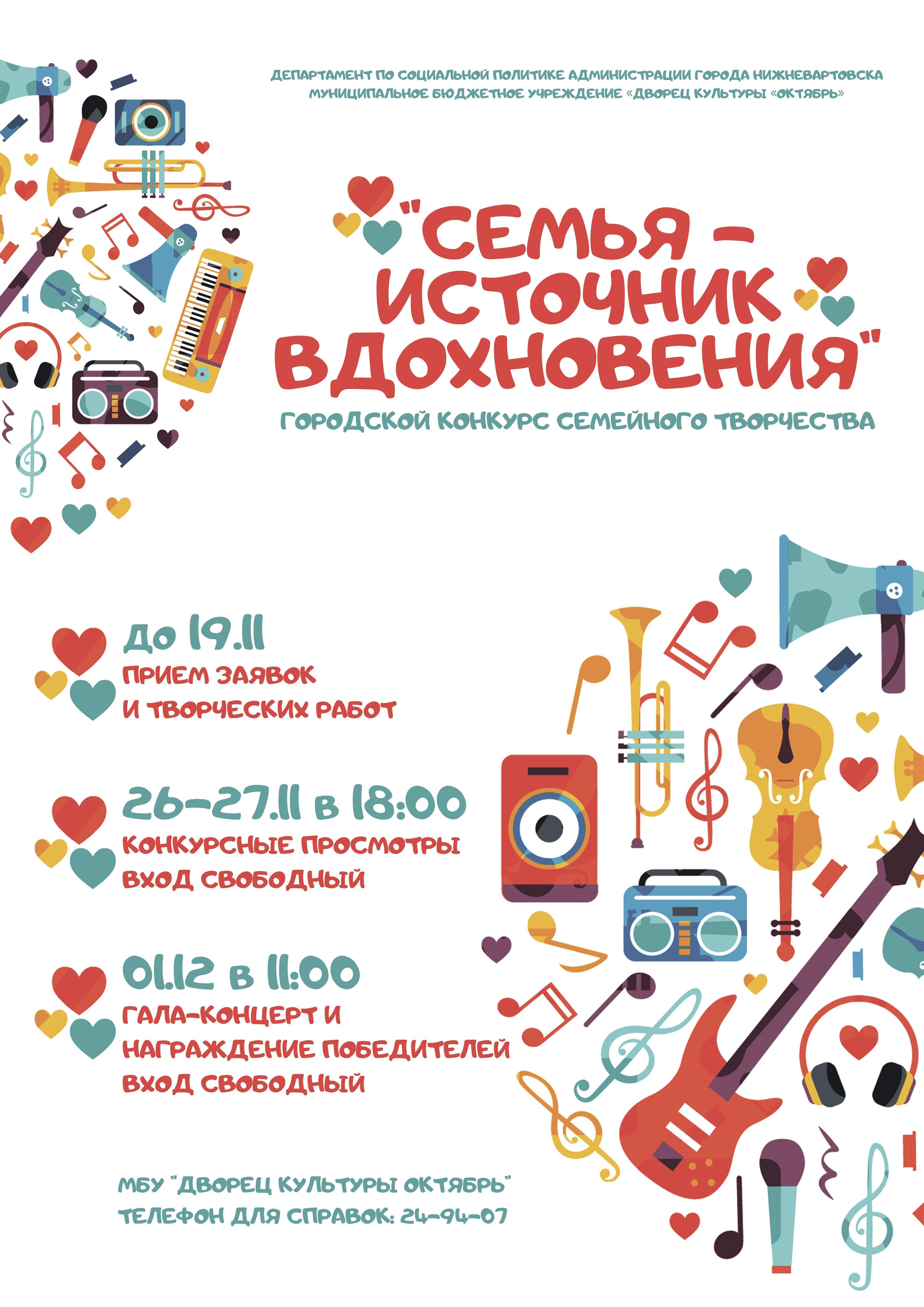 В целях содействия раскрытию творческого потенциала семей города Нижневартовска с 26 по 1 декабря 2018 года в городе Нижневартовске пройдет городской конкурс семейного творчества «Семья-источник вдохновения». Даты и время проведения: