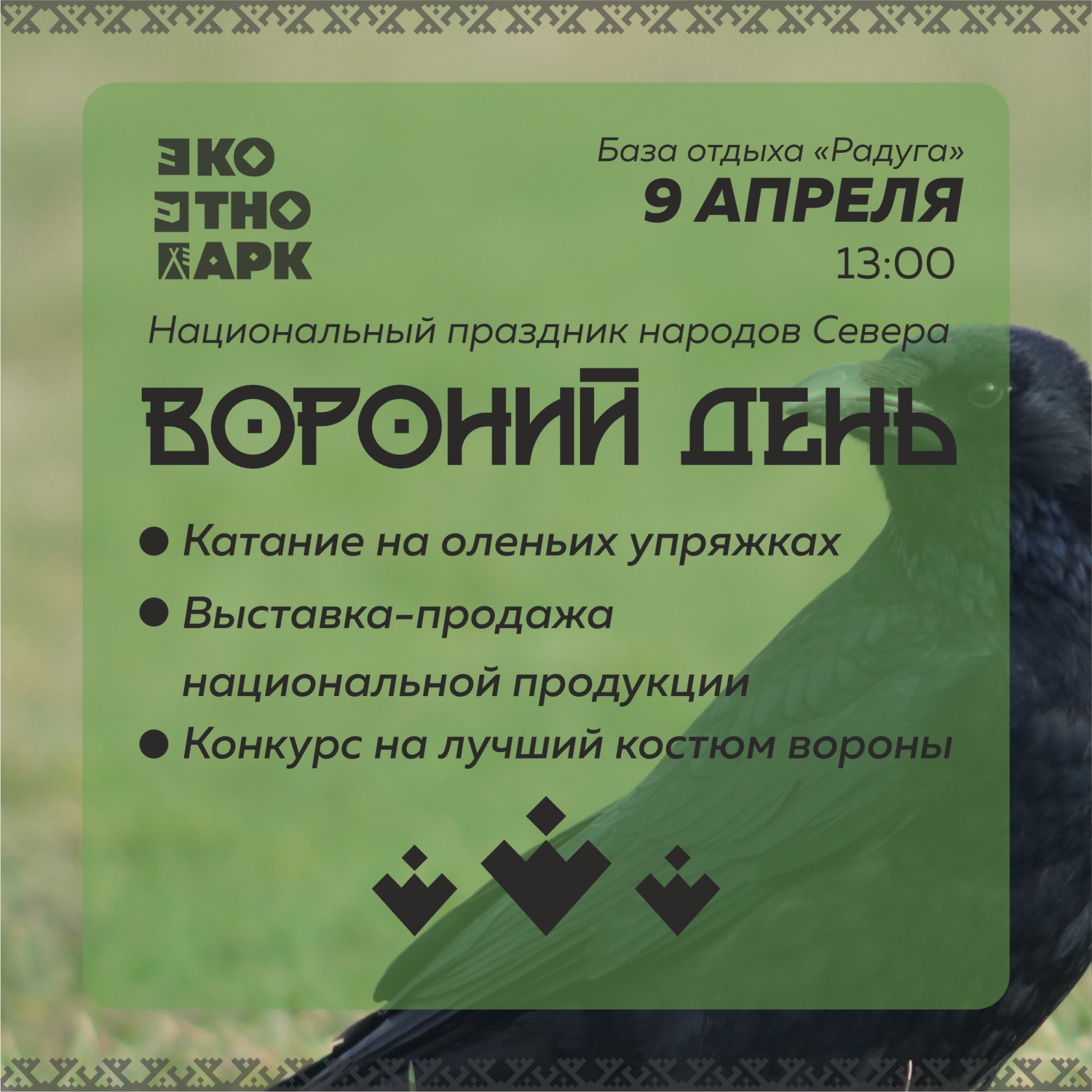 В программе мероприятия: театрализованное представление, выставка-ярмарка декоративно-прикладного творчества, катание на оленьих упряжках, конкурс на лучший костюм Ворон, мастер-классы по изготовлению оберегов и кукол «Ворона», площадка с традиционными играми народов Севера, торговля продукцией собственного производства местных товаропроизводителей. Также для всех гостей и участников мероприятия откроет двери Этнодеревня, где будут проведены бесплатные экскурсии.