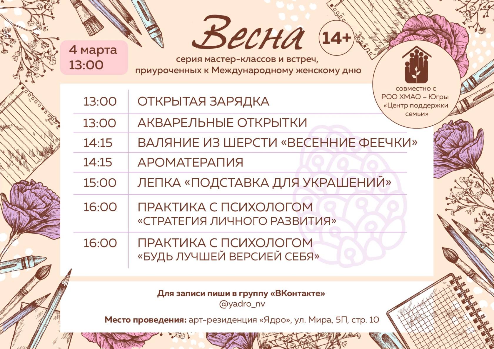 4 марта в 13:00 в арт-резиденции «Ядро» (ул. Мира, 5П, стр.10) пройдет серия мастер-классов и встреч, приуроченных к Международному женскому дню.