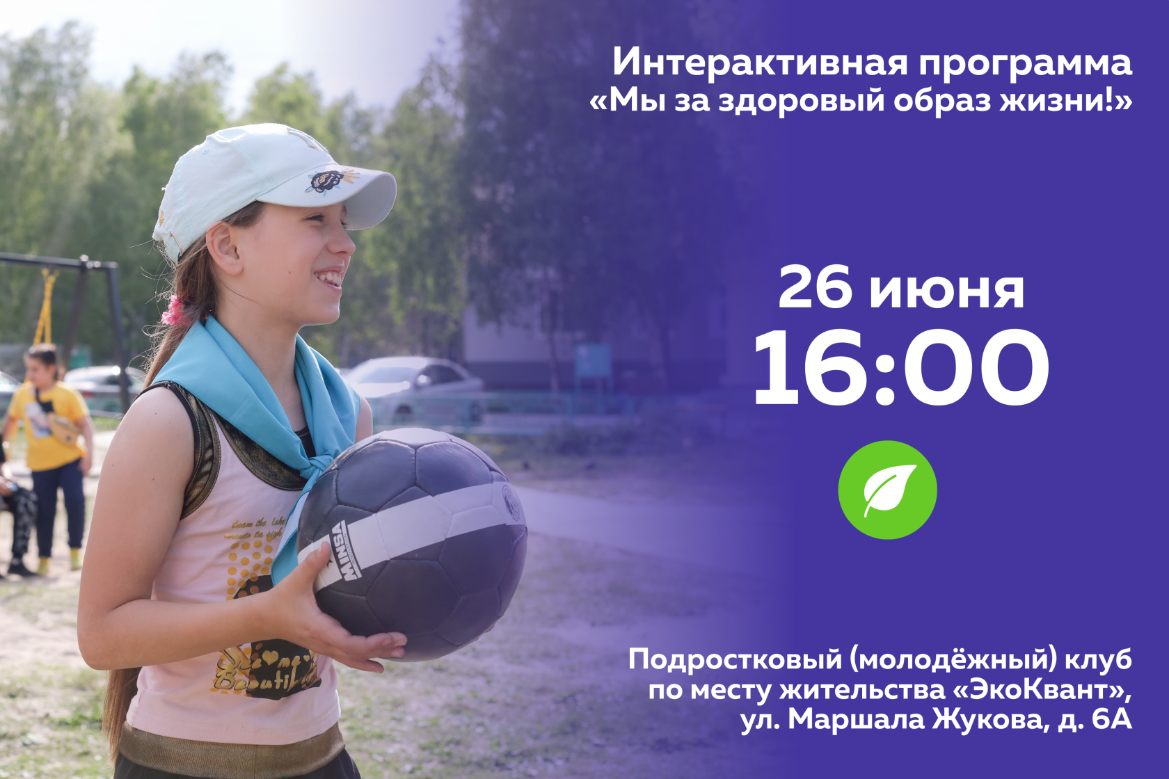 26 июня 2023 года в 16:00 на придворовой территории подросткового (молодёжного) клуба по месту жительства «ЭкоКвант» (ул. Маршала Жукова, д. 6А) пройдет интерактивная программа «Мы за здоровый образ жизни!». Данное мероприятие проводится с целью популяризации здорового образа жизни среди детей и молодёжи.