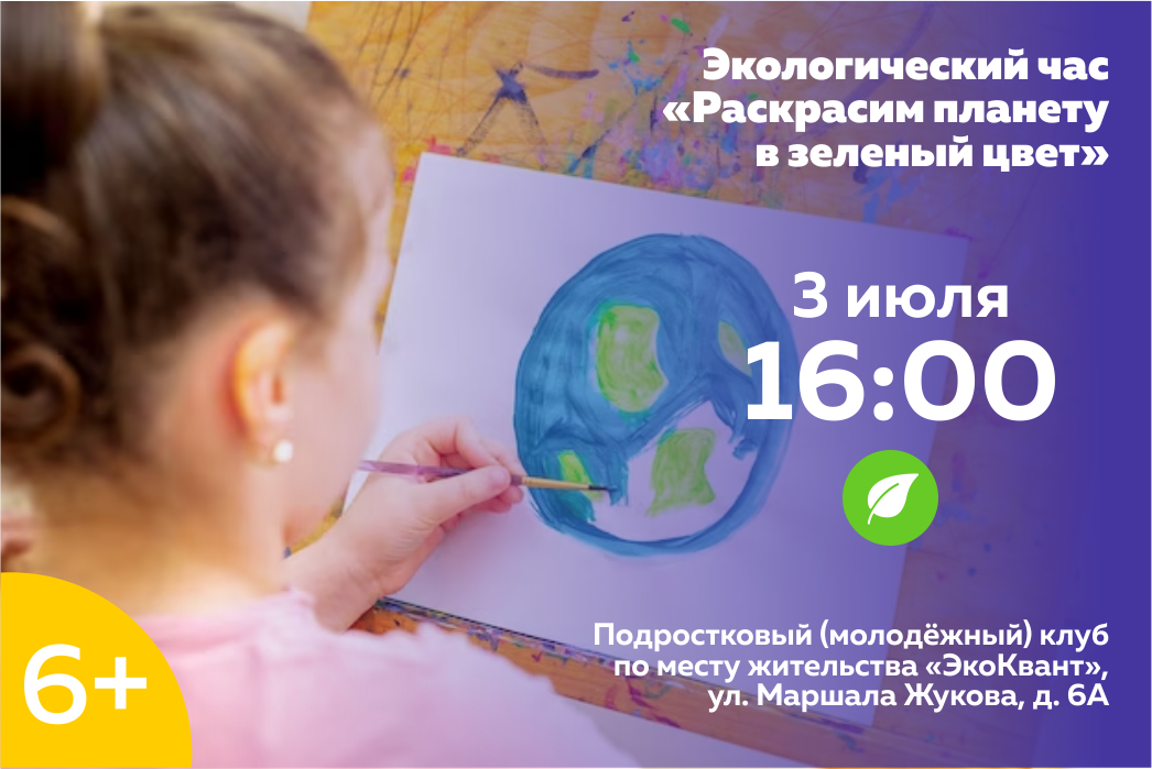 3 июля в 16 час. на базе подросткового клуба «ЭкоКвант» (ул. Маршала Жукова, д. 6А) пройдет экологический час «Раскрасим планету в зеленый цвет». Данное мероприятие проводится с целью формирования у детей и подростков ответственного отношения к экологии и природе, привлечения внимания к экологическим проблемам нашего города. Вход на мероприятия свободный. Всю актуальную информацию можно узнать в официальной группе в социальной сети ВКонтакте — «Подростковые (молодёжные) клубы г. Нижневартовск» по ссылке https://vk.com/teensnv или по телефону 41-72-72, по будням с 09:00 до 17:00 (обед с 13:00 до 14:00).