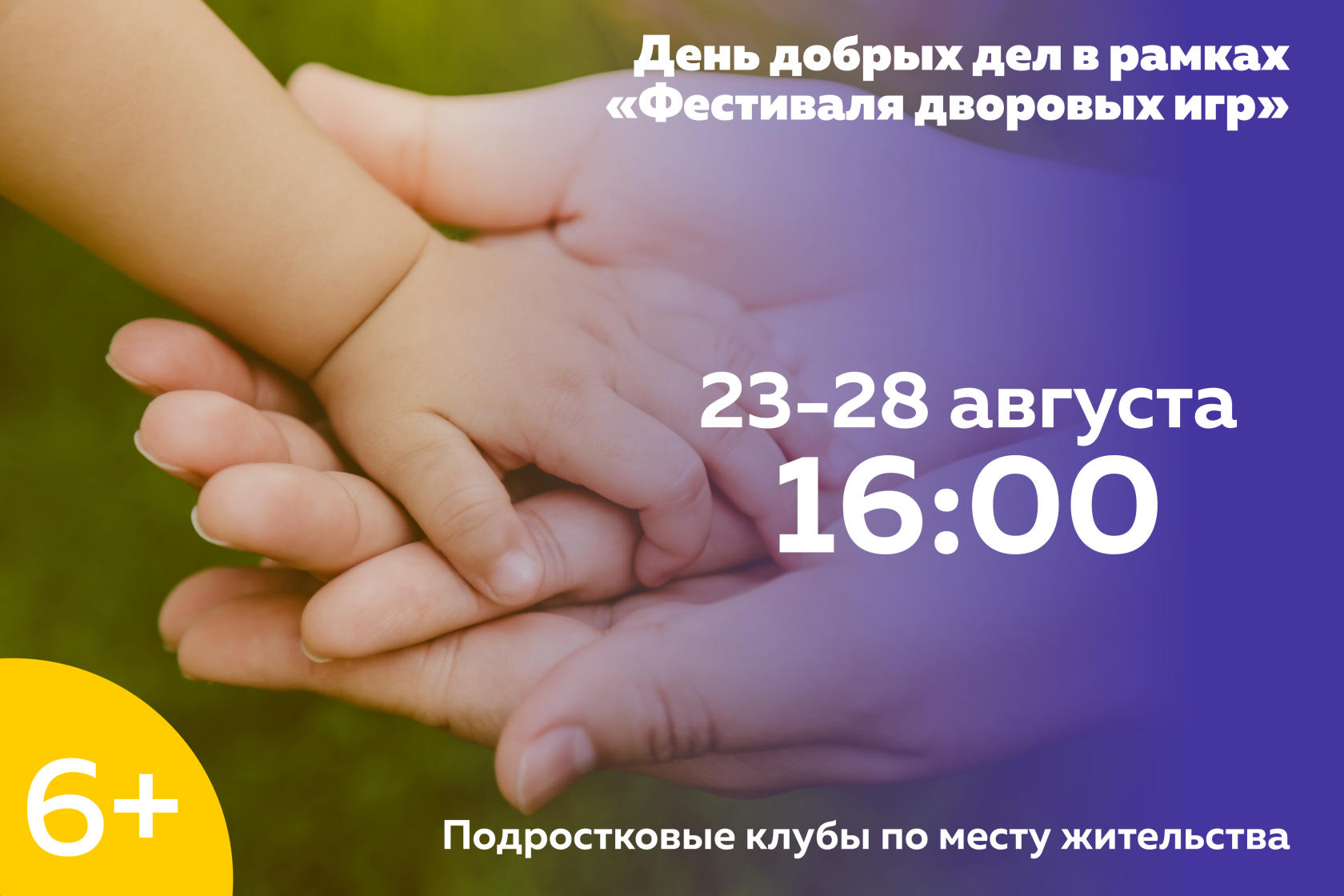 С 23 по 28 августа в подростковых клубах пройдет День добрых дел в рамках. Мероприятие проводится в рамках "Фестиваля дворовых игр", направленного на пропаганду здорового образа жизни, развитие комплексных механизмов привлечения внимания детей и подростков к сохранению здоровья. Желающие дети и подростки могут сделать любое доброе дело. Принять участие в субботнике на дворовой площадке, оказать помощь благотворительному фонду помощи бездомным животным по сбору корма, собрать добрые крышечки и др.