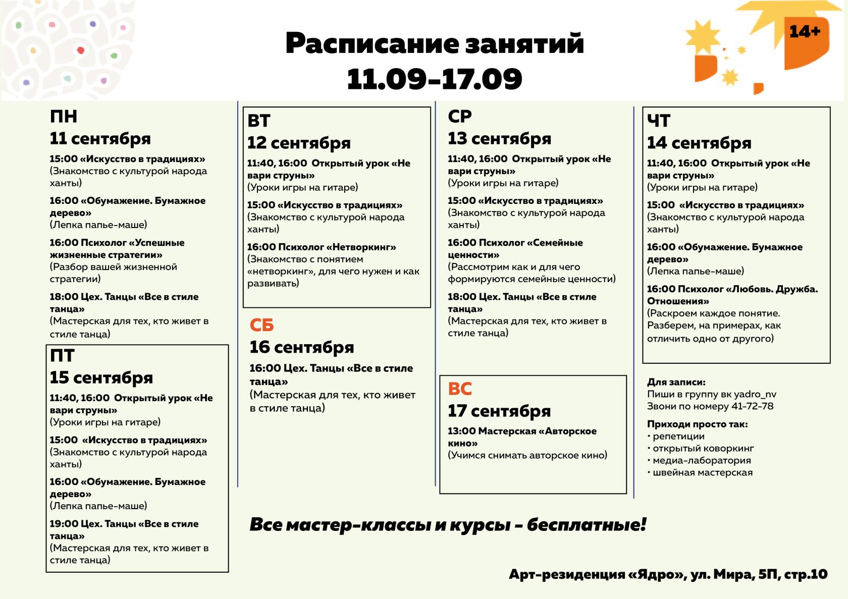 Расписание арт-резиденции «Ядро» С целью вовлечения молодежи в творческую деятельность в арт-резиденции «Ядро» ул. Мира 5П, стр. 10. проходят бесплатные творческие мероприятия. Запишись на мероприятие и узнай дополнительную информацию в группе социальной сети «ВКонтакте» — арт-резиденция «Ядро» https://vk.com/yadro_nv.