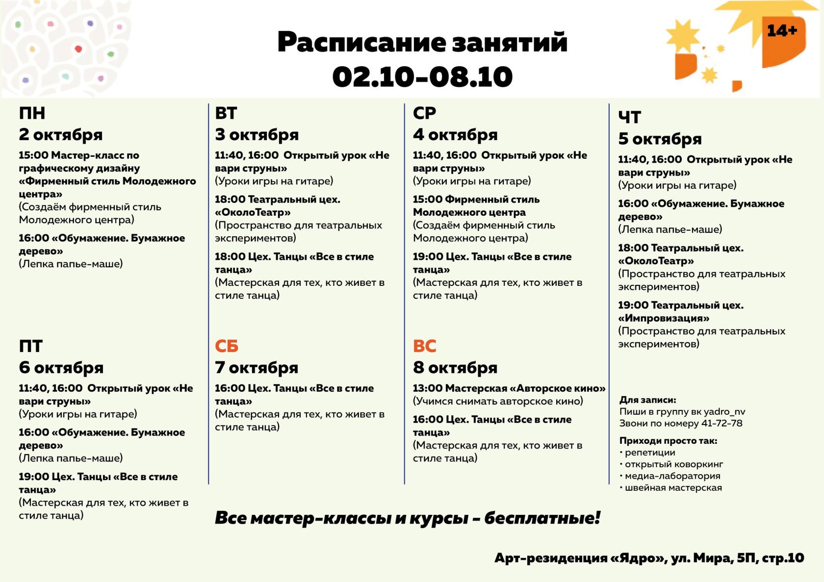 Расписание занятий 02.10-08.10 С целью вовлечения молодежи в творческую деятельность в арт-резиденции «Ядро» ул. Мира 5П, стр. 10. проходят бесплатные творческие мероприятия. Запишись на мероприятие и узнай дополнительную информацию в группе социальной сети «ВКонтакте» — арт-резиденция «Ядро» https://vk.com/yadro_nv.