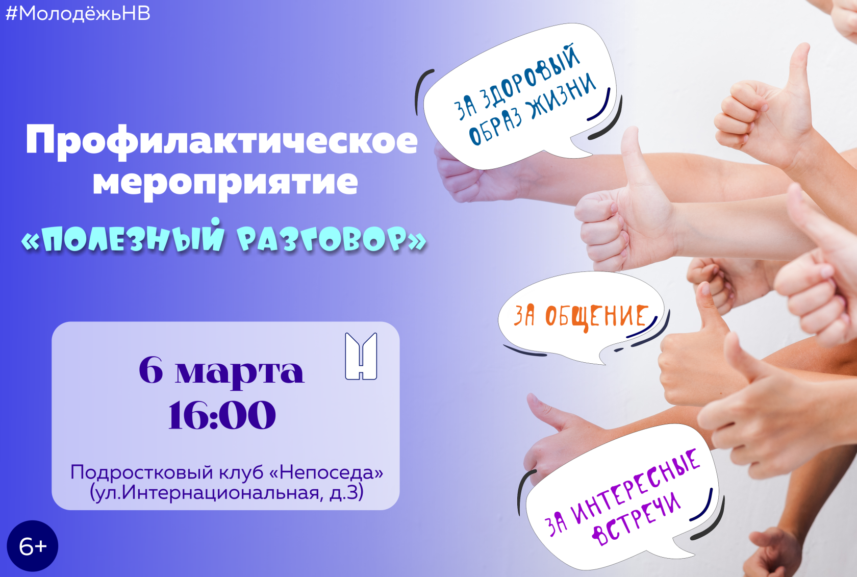 6 марта в 16 ч. на базе подросткового клуба «Непоседа» (ул. Интернациональная, д.3,) состоится встреча с психологом АНО «Центр социальной реабилитации «Феникс» Кондраковой Оксаной Михайловной. Данное мероприятие проводится с целью популяризации здорового образа жизни и профилактики вредных привычек среди несовершеннолетних.