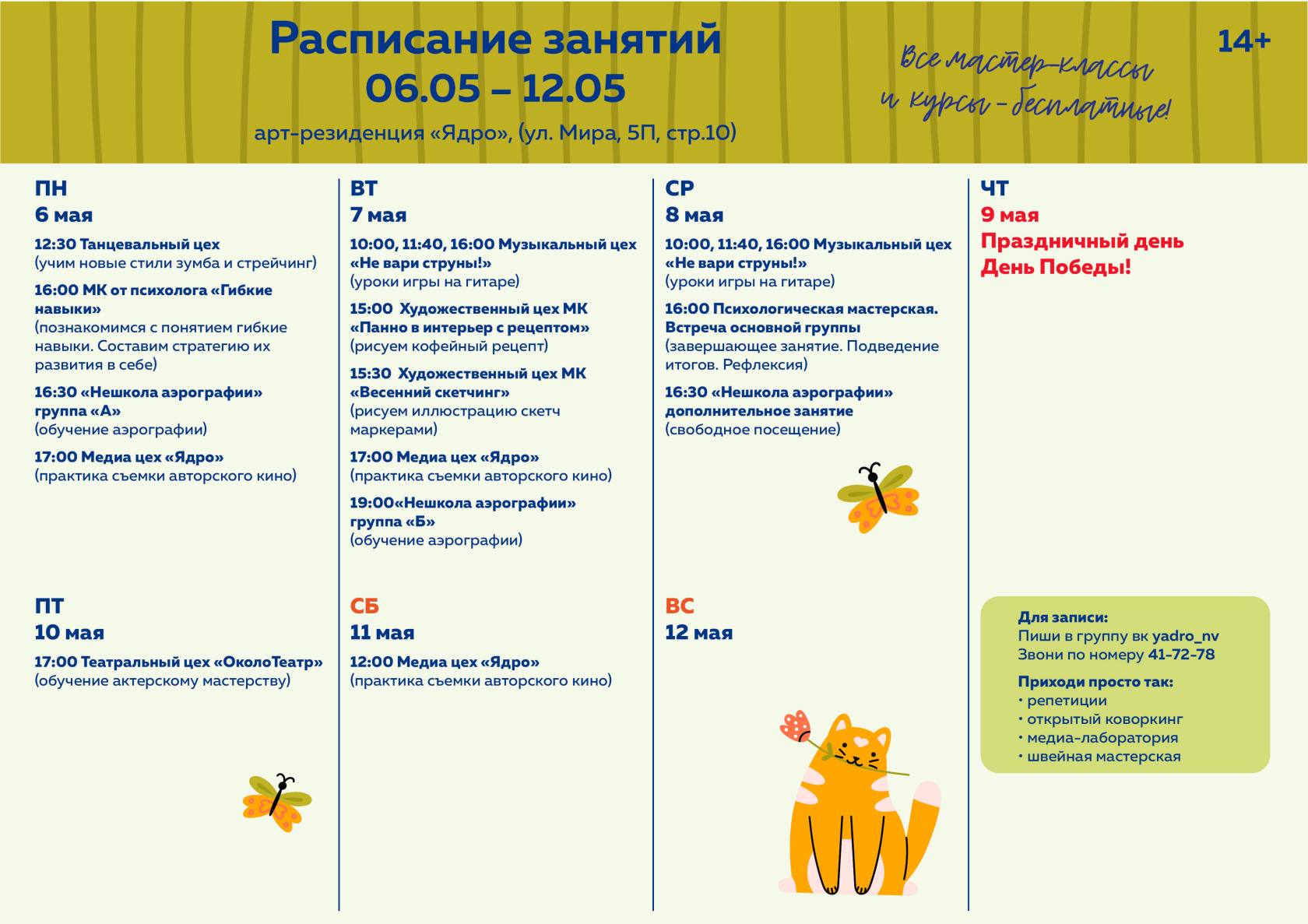 По предварительной записи по телефону – 41-72-78. Запишись на мероприятие и узнай дополнительную информацию в группе социальной сети «ВКонтакте» — арт-резиденция «Ядро» https://vk.com/yadro_nv.