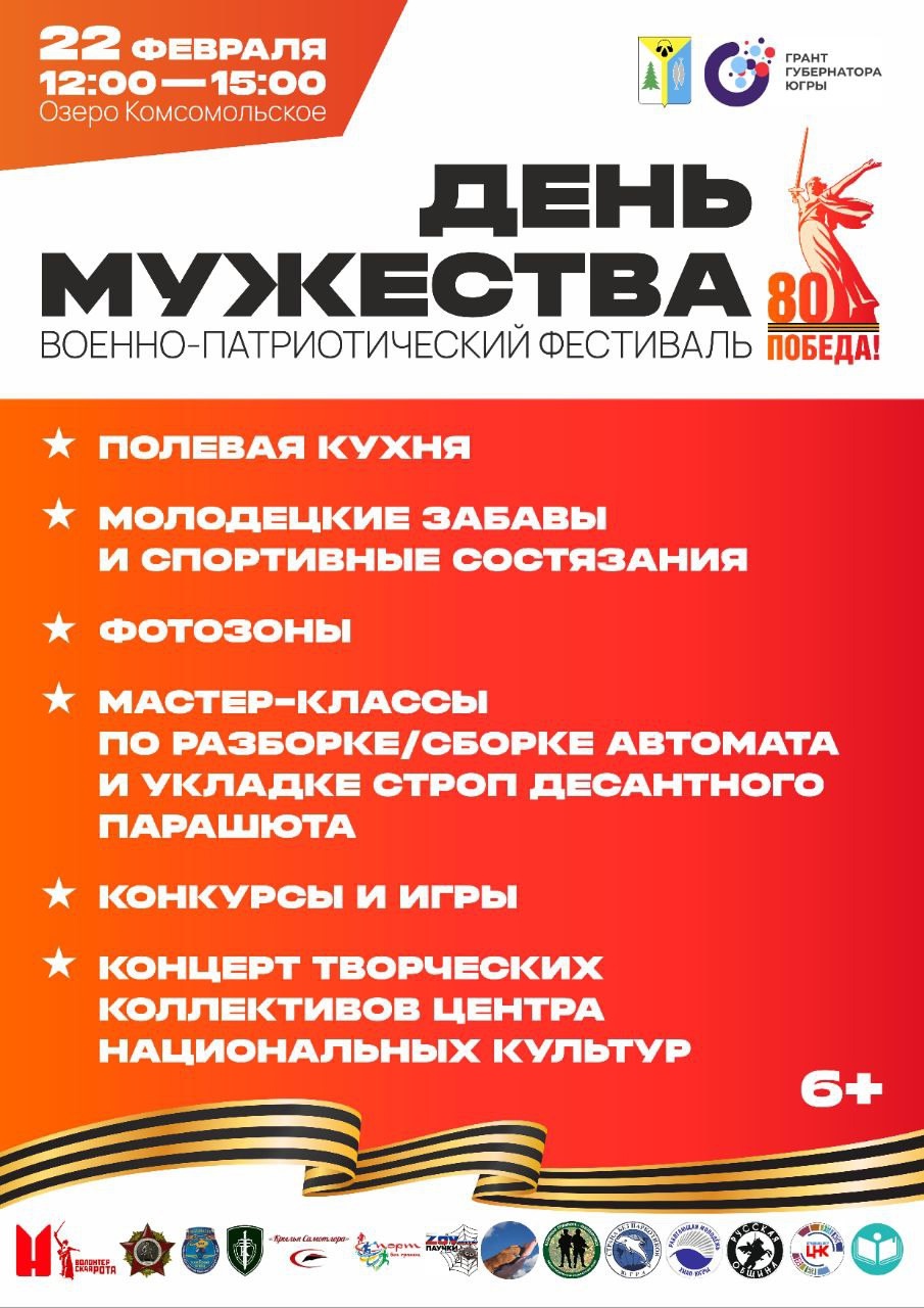 22 февраля 2025 года на Комсомольском озере прошел военно-патриотический фестиваль «День Мужества», приуроченный к празднованию 80-й годовщины Победы советского народа в Великой Отечественной войне. Организованны мастер-классы по сборке/разборке макета автомата Калашникова и укладке строп авиационно-спасательного парашюта, выступление артистов, тематические фотозоны и работа полевой кухни.