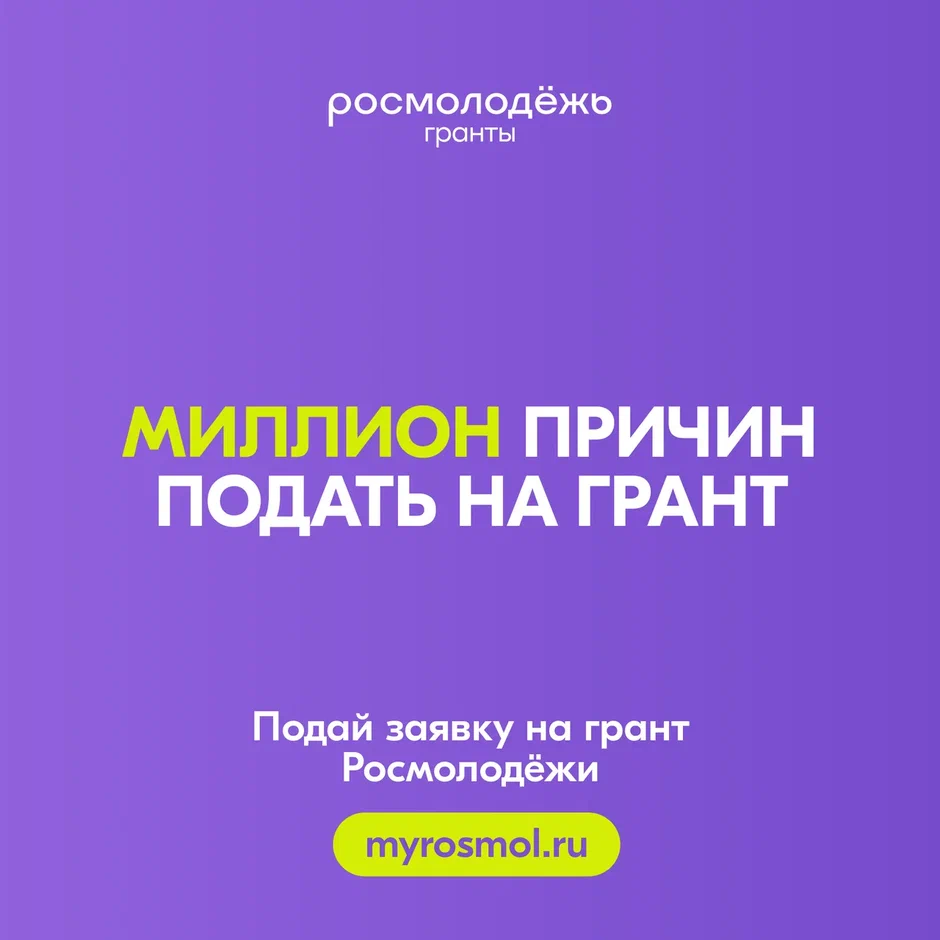 Молодёжь в возрасте от 14 до 35 лет включительно приглашается к участию в заочном конкурсе для физических лиц «Росмолодёжь. Гранты 1 сезон». Минимальный размер гранта, на который может претендовать участник – 5 тысяч рублей, максимальный – 1 миллион рублей. Заявки принимаются до 17 марта 2025 года. Соискатель грантовой поддержки вправе представить не более одной заявки, содержащей один проект, в номинациях: Подробности на сайте Федерального агентства по делам молодёжи: https://myrosmol.ru/events/3746e0b6-6d27-44d0-b079-130f82cdab46.