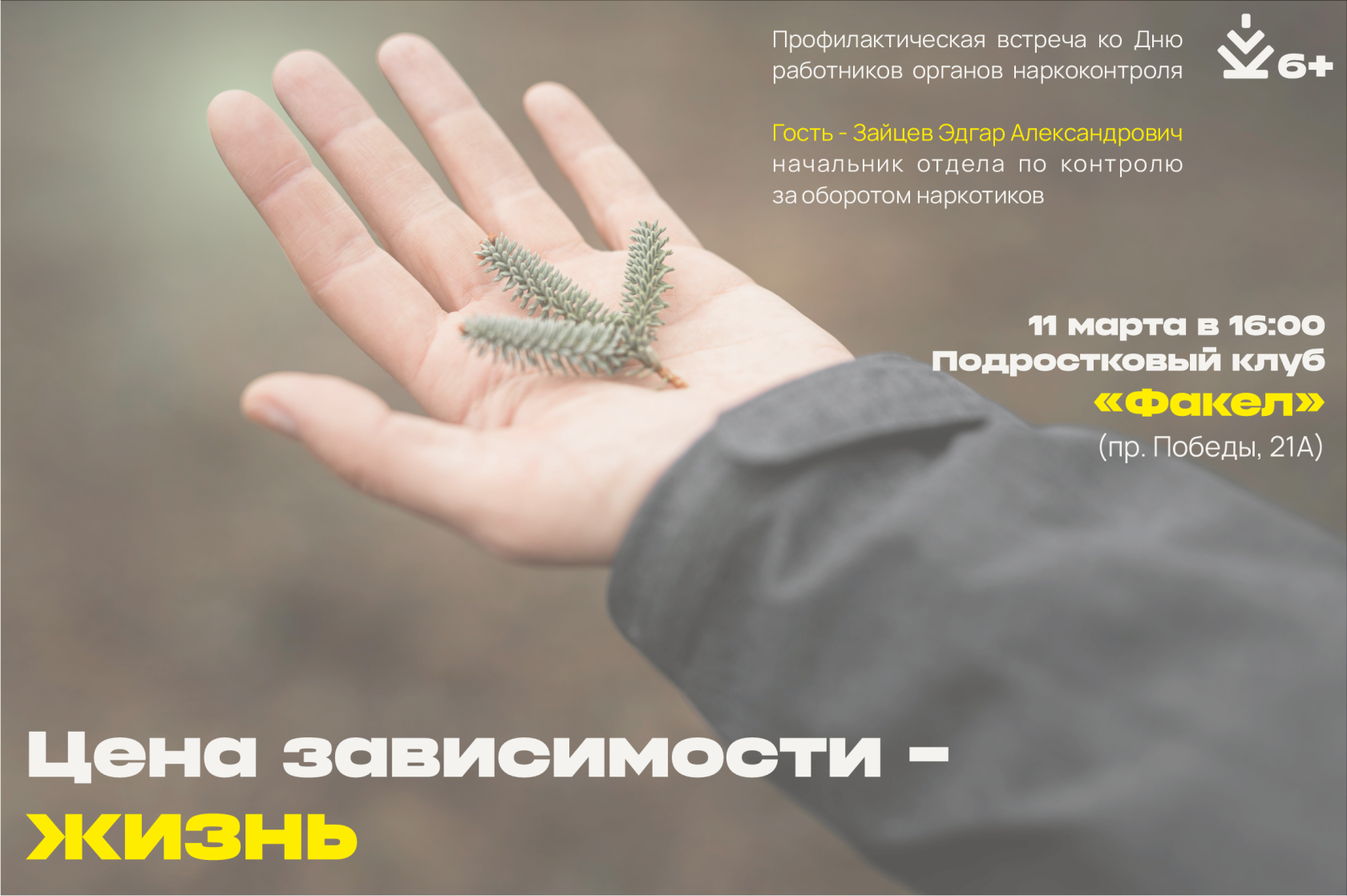 11 марта 2026 года в 16:00 в подростковом клубе «Факел» (пр. Победы, 21А) состоится профилактическое мероприятие ко Дню работников органов наркоконтроля «Цена зависимости — жизнь». Гость встречи — начальник отдела по контролю за оборотом наркотиков Эдгар Александрович Зайцев.