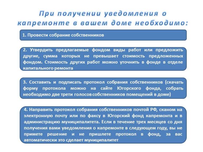 Протокол своего решения собственники должны направить в Югорский фонд и в администрацию своего муниципального образования. Если собственники помещений в течение трех месяцев не направят свое подтверждение или предложения по изменению работ, администрация муниципалитета принимает решение самостоятельно, подтверждая запланированные программой работы.