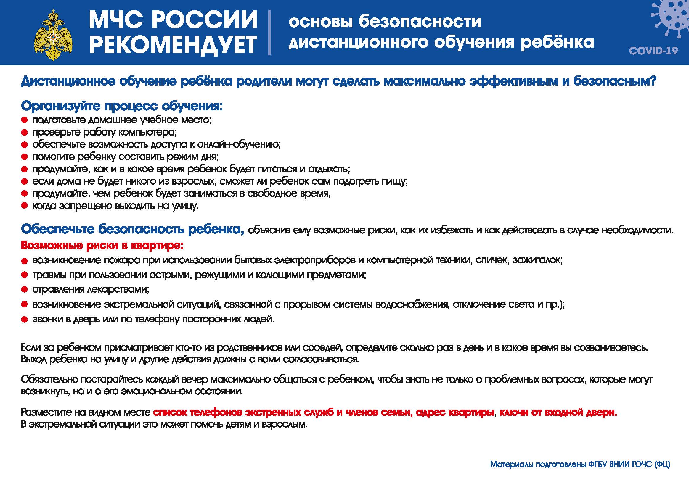 МЧС России разработало памятку "Как сделать дистанционное обучение максимально эффективным и безопасным". В ней содержится полезная информация о правилах безопасного поведения ребенка дома, об организации его рабочего места, о планировании режима дня и др. Подробные рекомендации смотрите в прикрепленном файле.