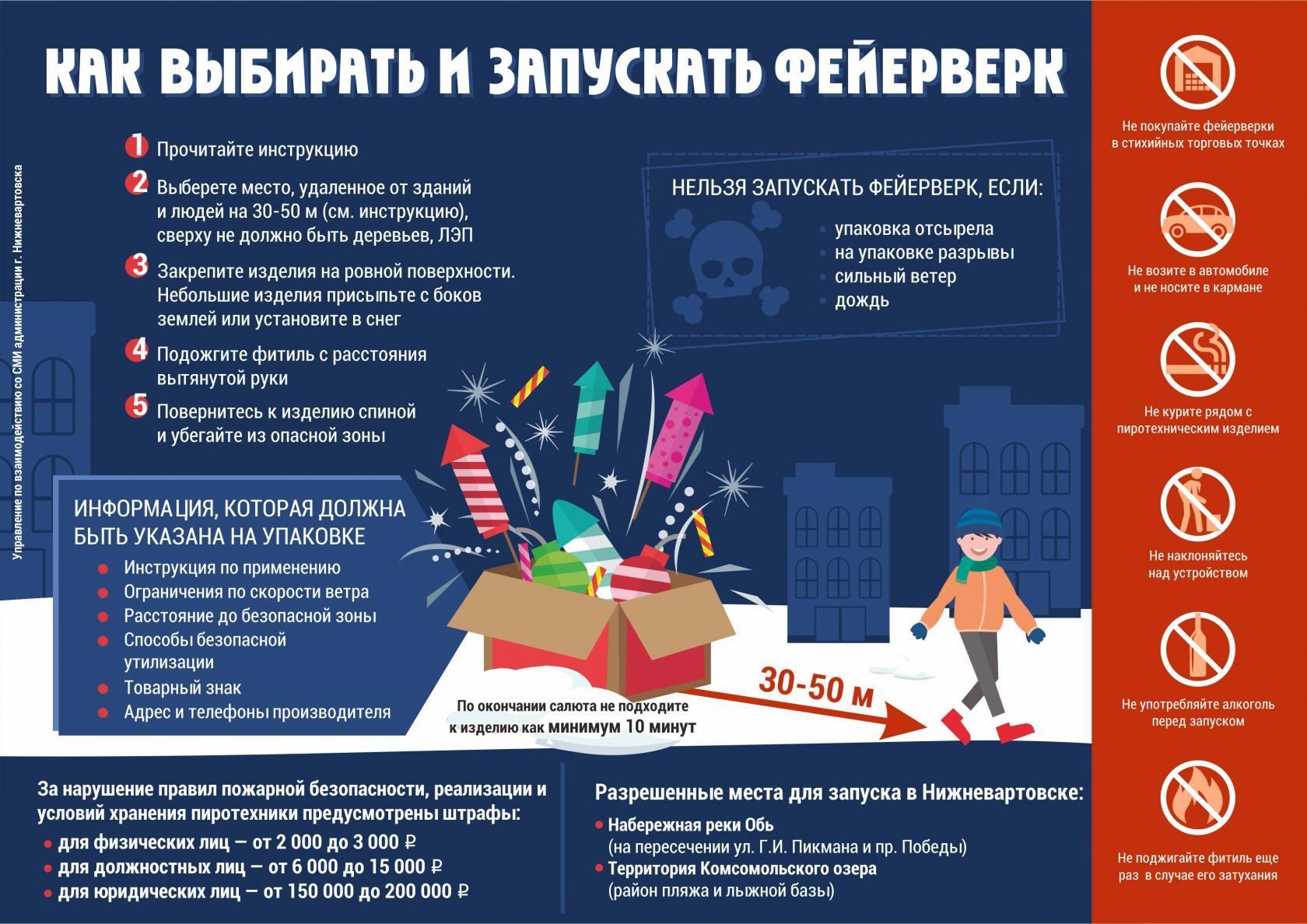 Напомним, в Нижневартовске запускать фейерверки можно на набережной реки Оби (в районе пересечения улицы Г.И. Пикмана и проспекта Победы) и на территории Комсомольского озера (район пляжа и лыжной базы). Эти места определены постановлением администрации города от 30.01.2012 №83 «Об организации, порядке и местах проведения массовых зрелищных мероприятий с устройством фейерверков и применением других пиротехнических изделий на территории города Нижневартовска» (с изменениями от 11.07.2013 №1382).