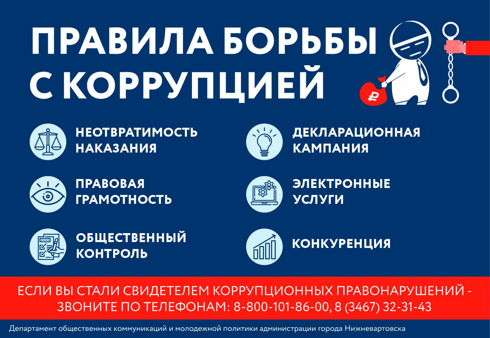 Для сведения: на официальном сайте ОМС города Нижневартовска в разделе «Безопасный город» в рубрике «Правила безопасности» размещена актуальная информация о действиях граждан по предупреждению коррупции.