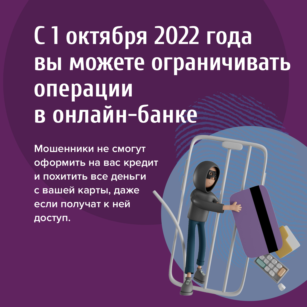 С 1 октября 2022 года вступили в силу новые правила по ограничению онлайн-операций, согласно которым клиенты могут самостоятельно устанавливать запрет на их проведение либо ограничить параметры данных операций.