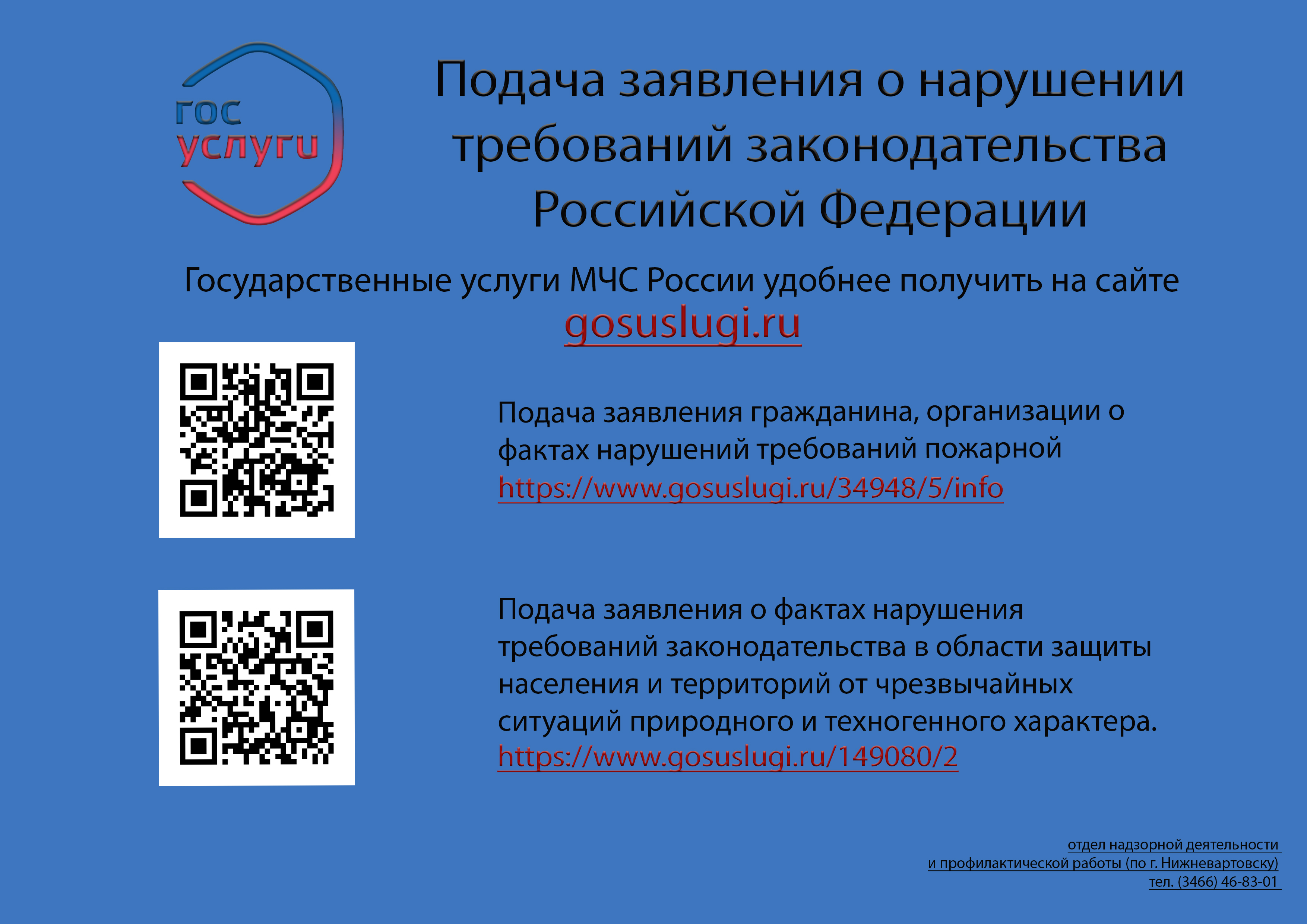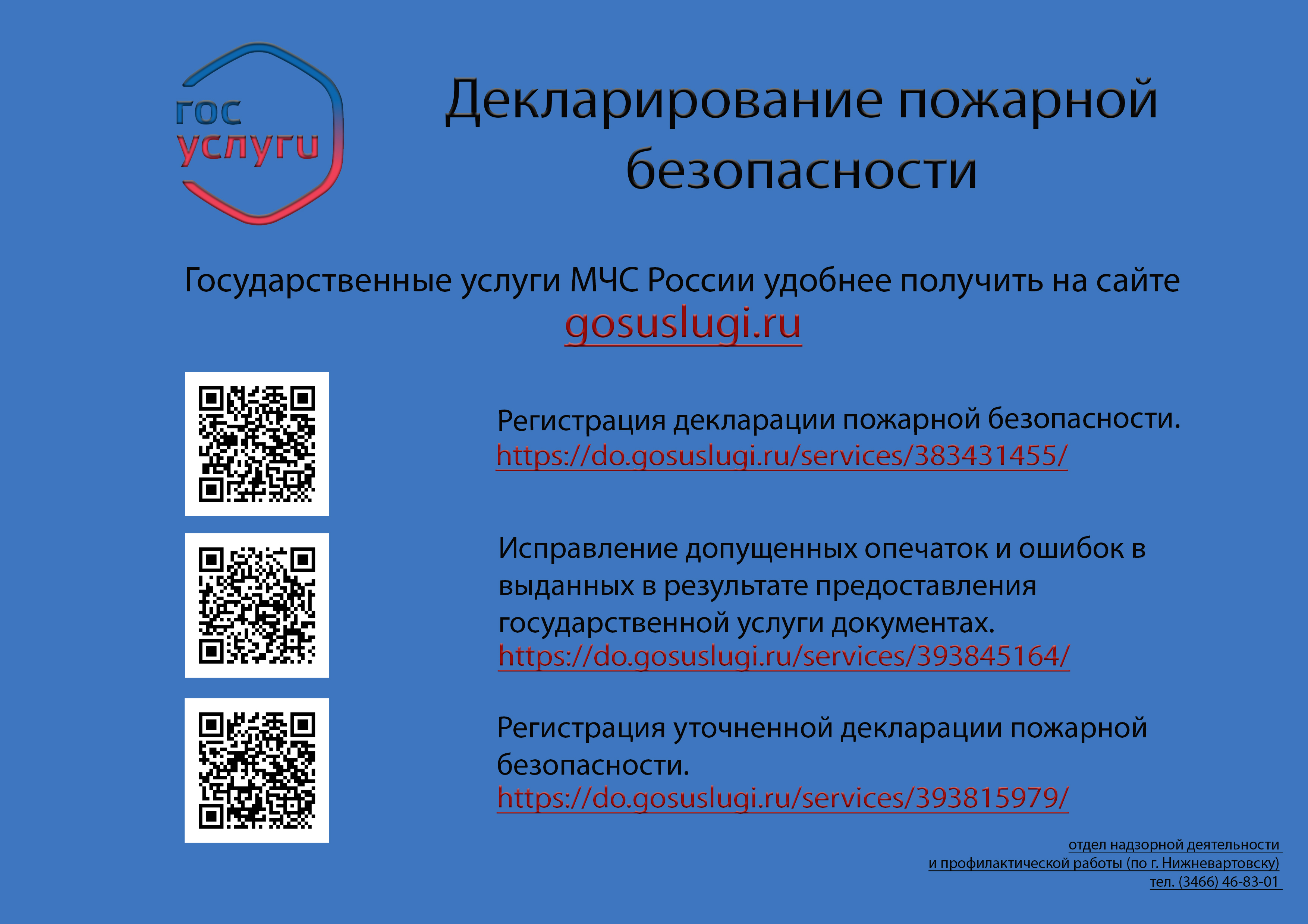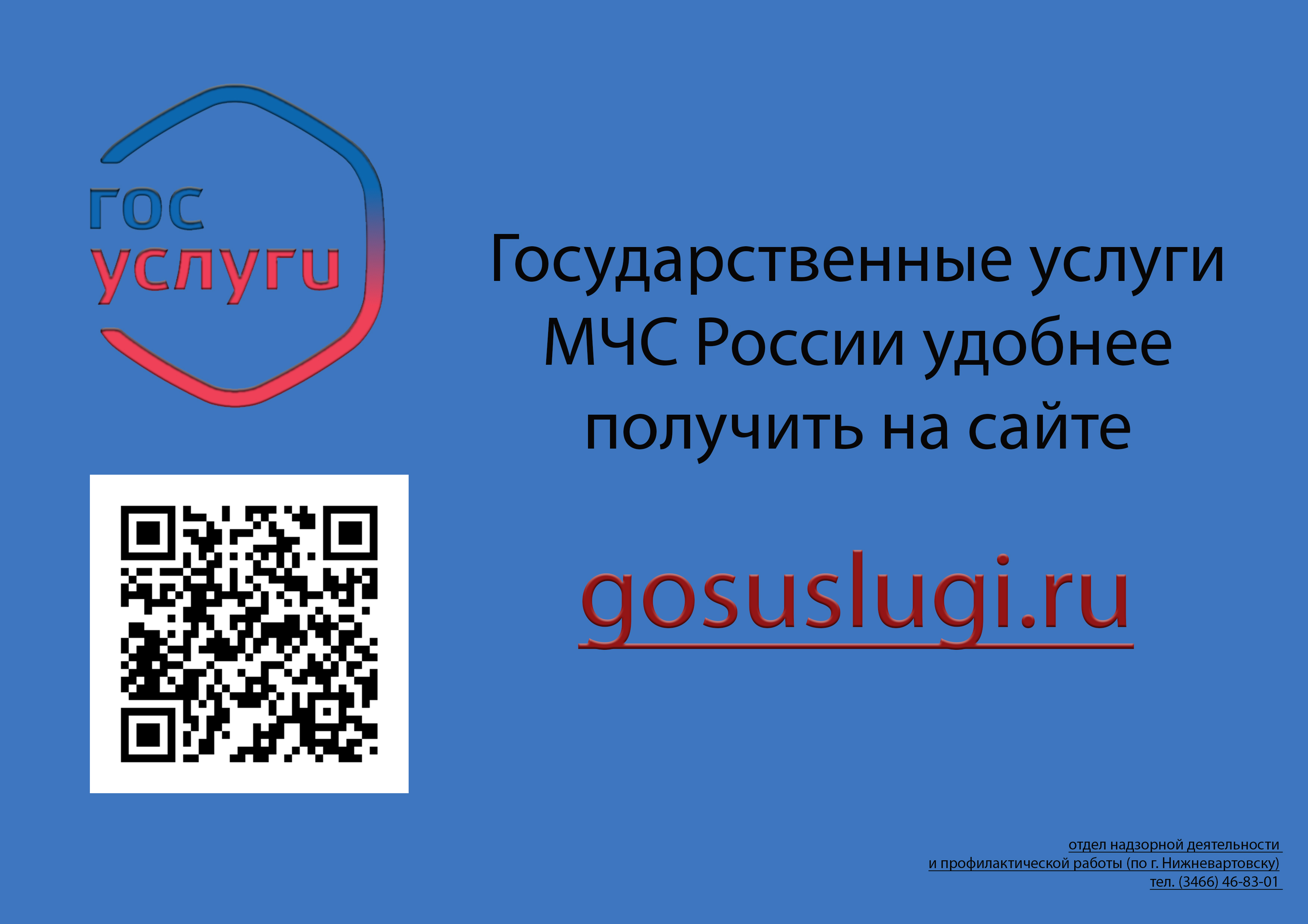 На Едином портале государственных и муниципальных услуг (функций) оказызываются услуги МЧС России. С их перечнем можно ознакомиться в прикрепленных ниже файлах. Также для удобства граждан в информационных памятках размещены кюар-коды, по которым можно перейти на портал "ГОСУСЛУГИ".