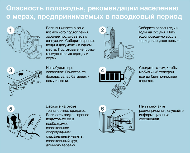 По возможности вывести с подверженных подтоплению территорий детей, пожилых людей, убрать транспортные средства, обеспечить безопасность домашних животных.