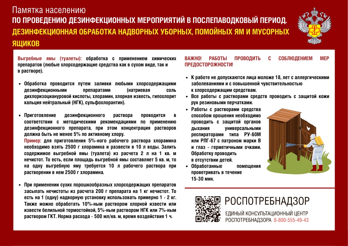 Памятки с рекомендациями, какие меры следует принять после отступления воды для профилактики инфекционной заболеваемости, как правильно проводить дезинфекцию и какие при этом использовать средства, см. ниже.