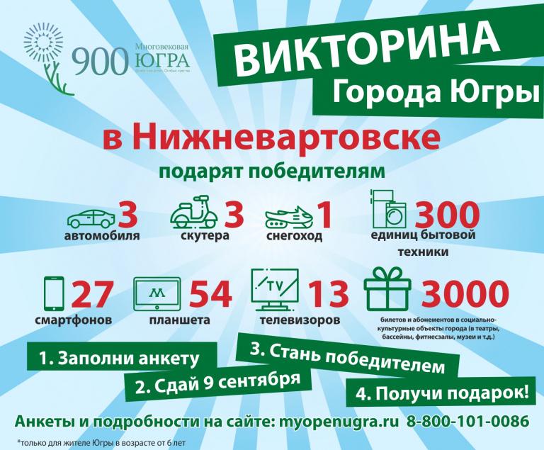 Всю информацию можете отслеживать самостоятельно на портале «Открытый регион – Югра» (myopenugra.ru) в разделе «ЮГРЕ – 900». Кроме этого, каждый участник викторины получит подарок при сдаче анкеты. А те, кто правильно ответил на вопросы анкеты, станет победителем и получит, обратившись к организатору, диплом победителя.