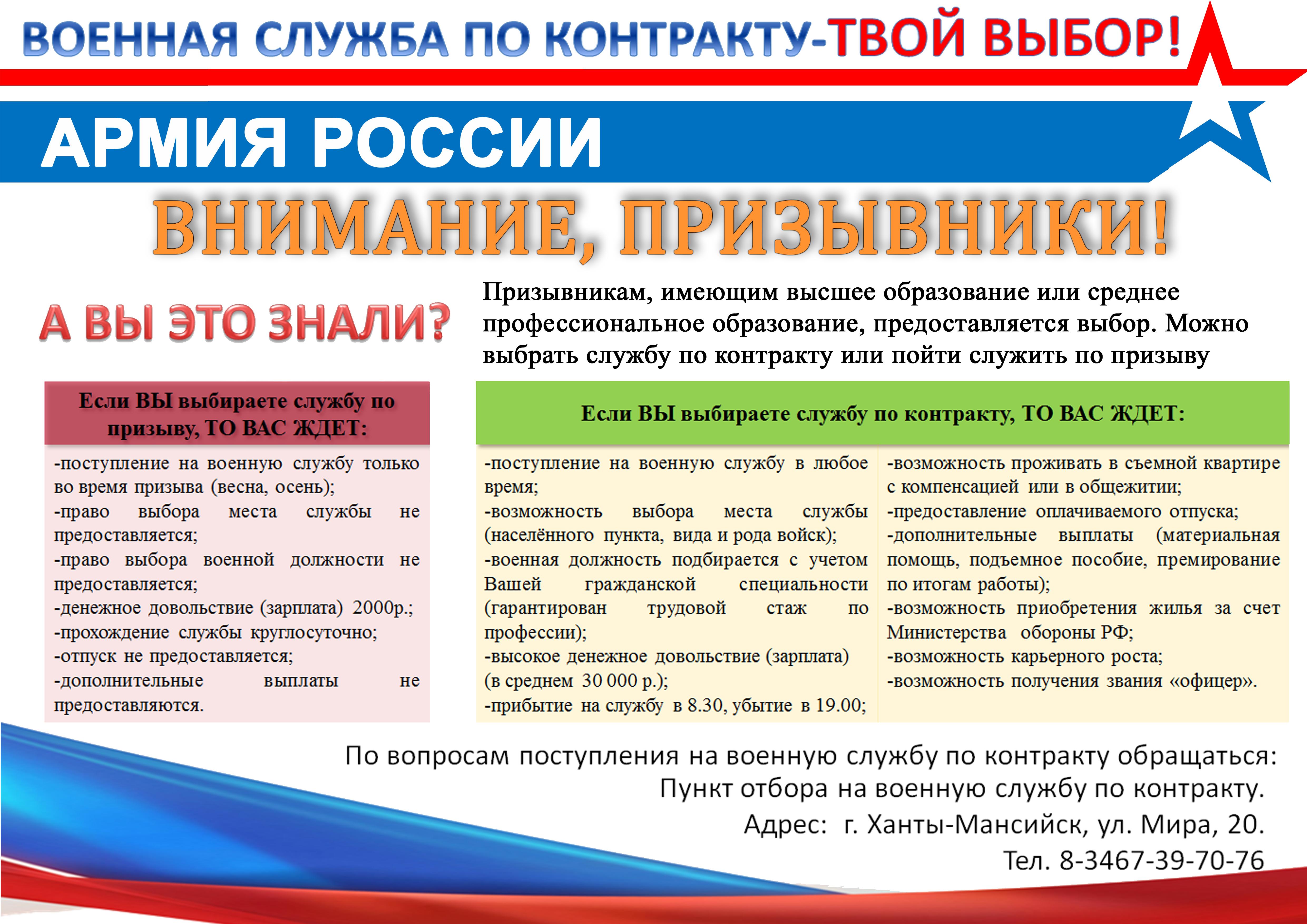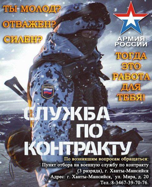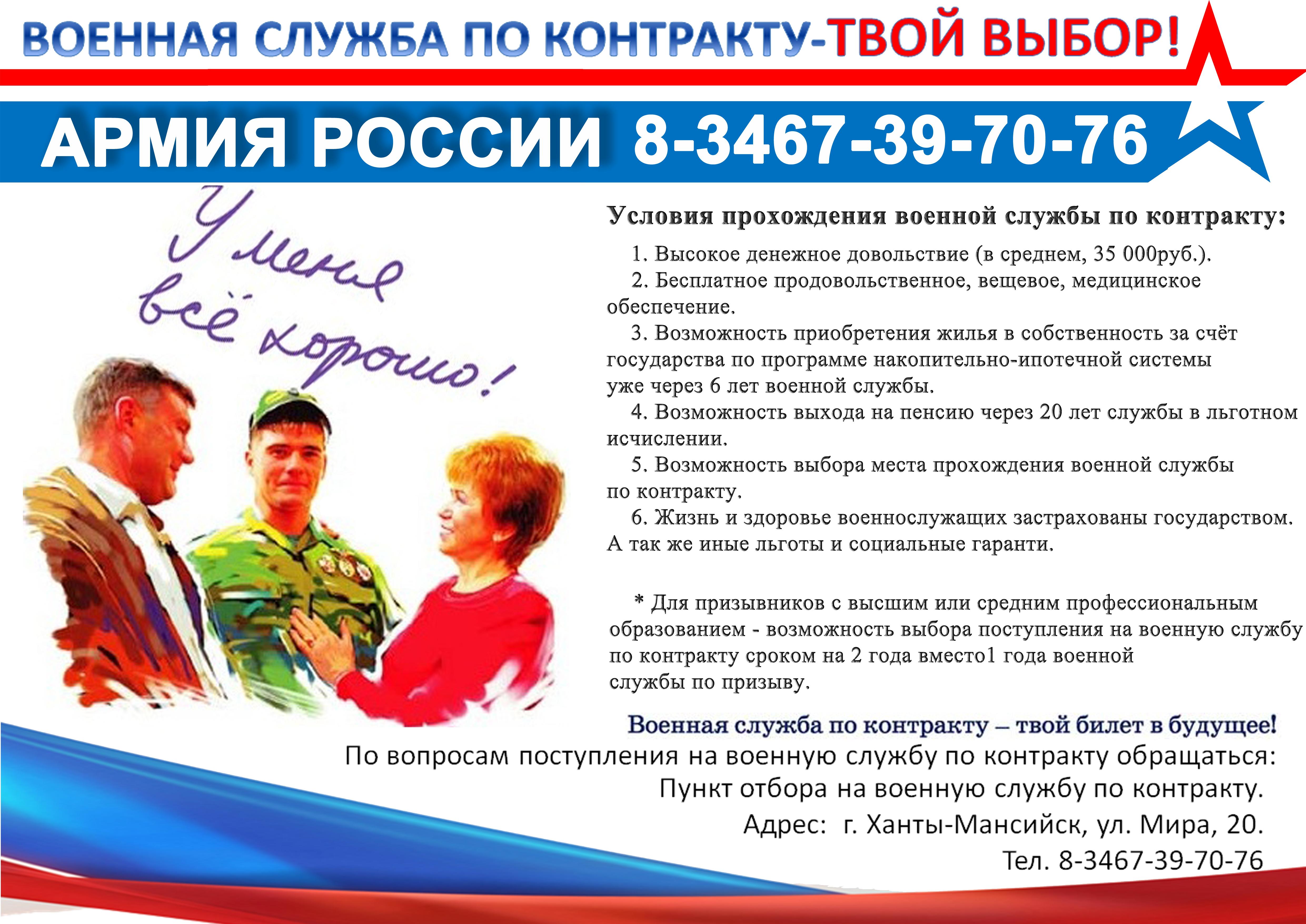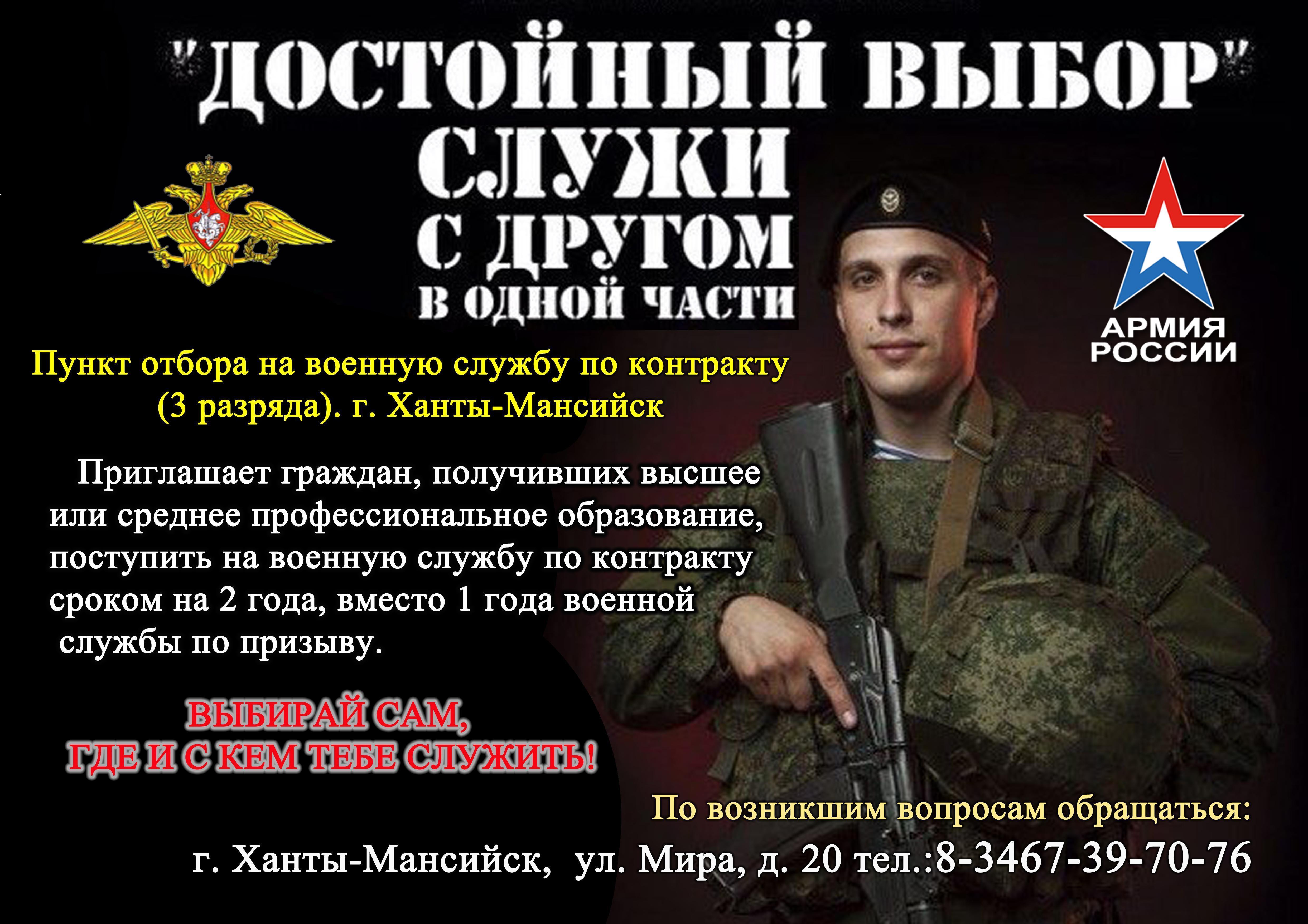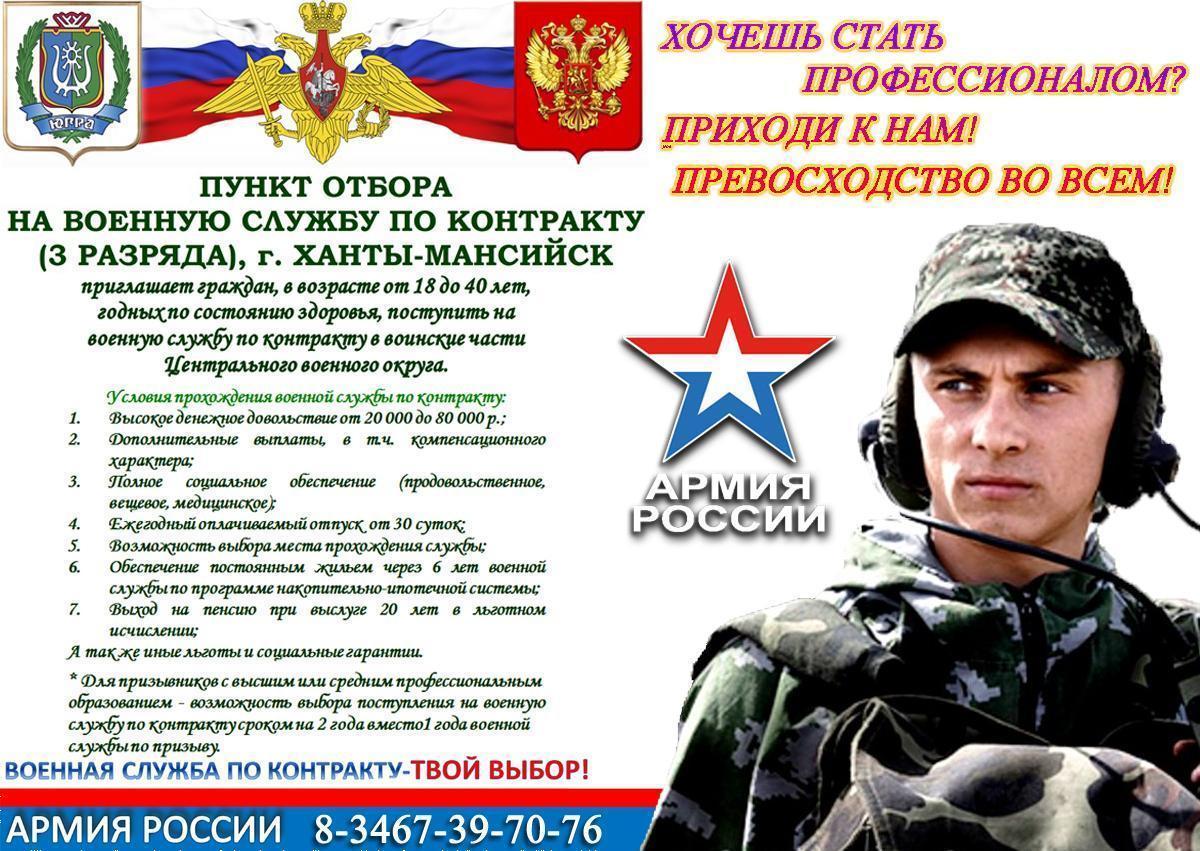 Пункт отбора на военную службу по контракту по ХМАО-Югре приглашает граждан в возрасте от 18 до 40 лет, годных по состоянию здоровья, для поступления на военную службу по контракту, а также сообщает, что в соответствии с Федеральным законом от 28 марта 1998 года НР 53-ФЗ гражданам, подлежащим призыву (призывникам) и получившим высшее или среднее профессиональное образование, предоставлено право заключить контракт о прохождении военной службы в Вооруженных Силах Российской Федерации на 2 года вместо 1 года военной службы по призыву.