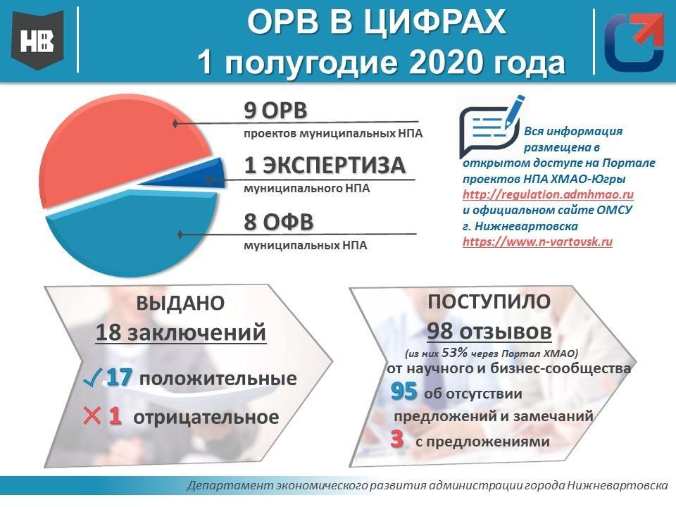 Департаментом экономического развития администрации города Нижневартовска подведены итоги проведения оценки регулирующего воздействия (ОРВ) проектов муниципальных нормативных правовых актов, экспертизы и оценки фактического воздействия (ОФВ) муниципальных нормативных правовых актов (НПА), затрагивающих вопросы осуществления предпринимательской и инвестиционной деятельности, за 1 полугодие 2020 года.